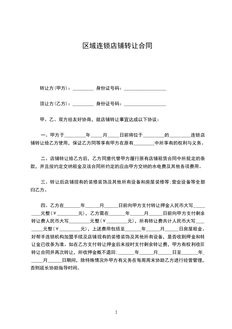 一、甲方于_________年_____月_____日前将位于_________的_________连锁店铺转让给乙方使用,保证乙方同等享有甲方在原有_________中所享有的权利与义务。