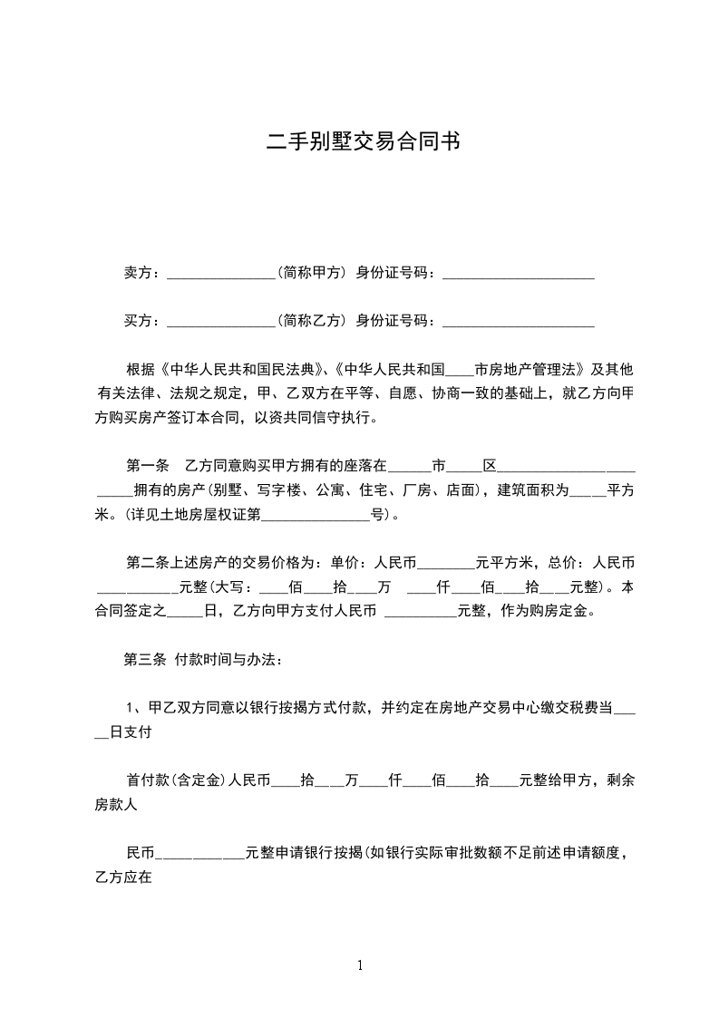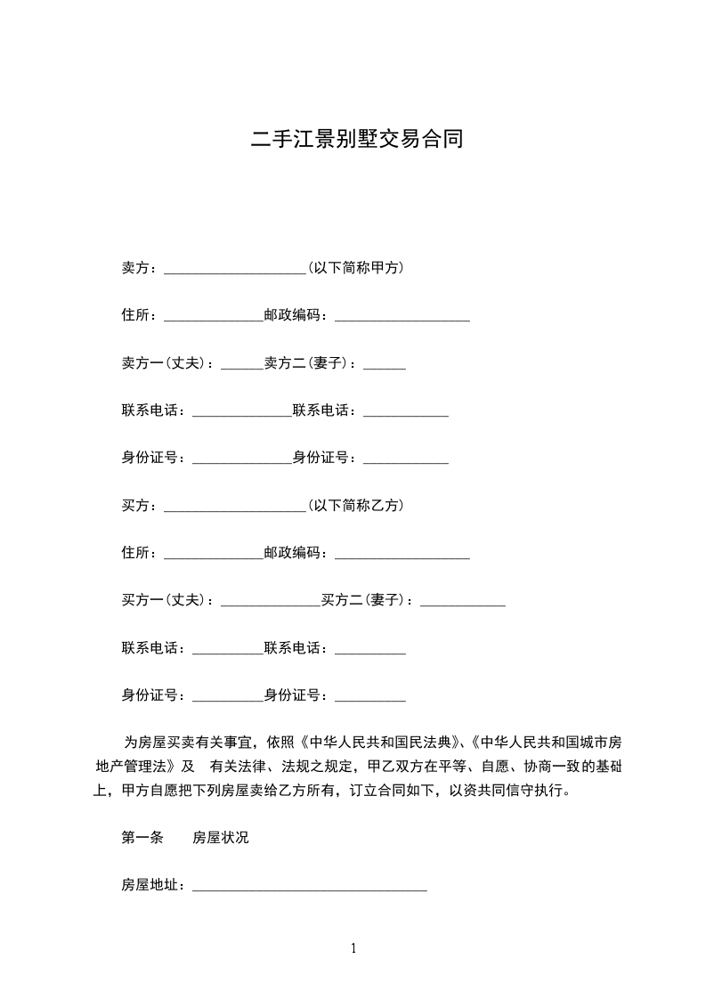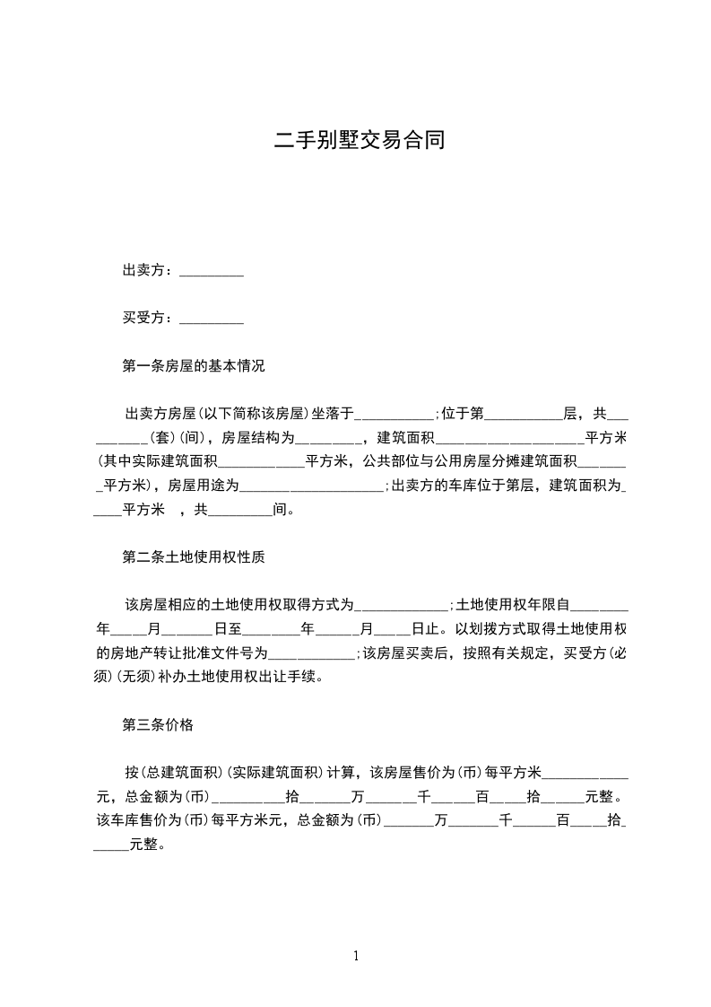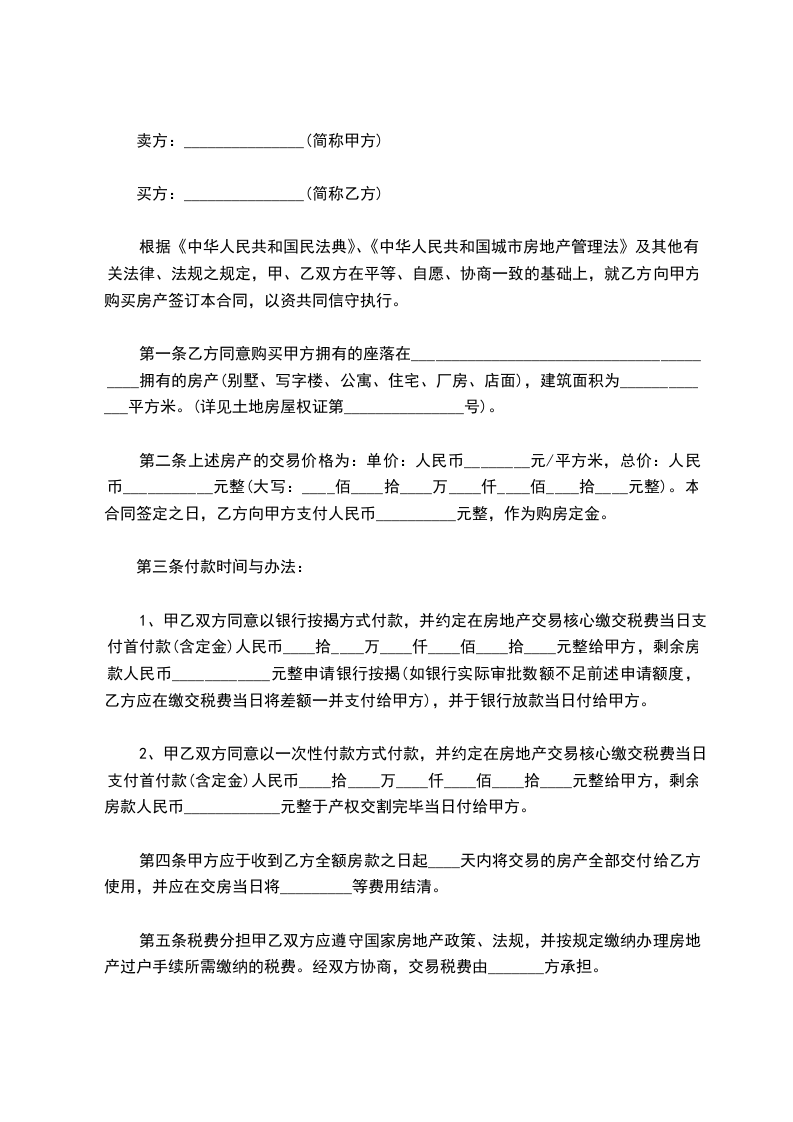 第一条乙方同意购买甲方拥有的座落在________________________________________拥有的房产(别墅、写字楼、公寓、住宅、厂房、店面),建筑面积为_____________平方米。(详见土地房屋权证第_______________号)。