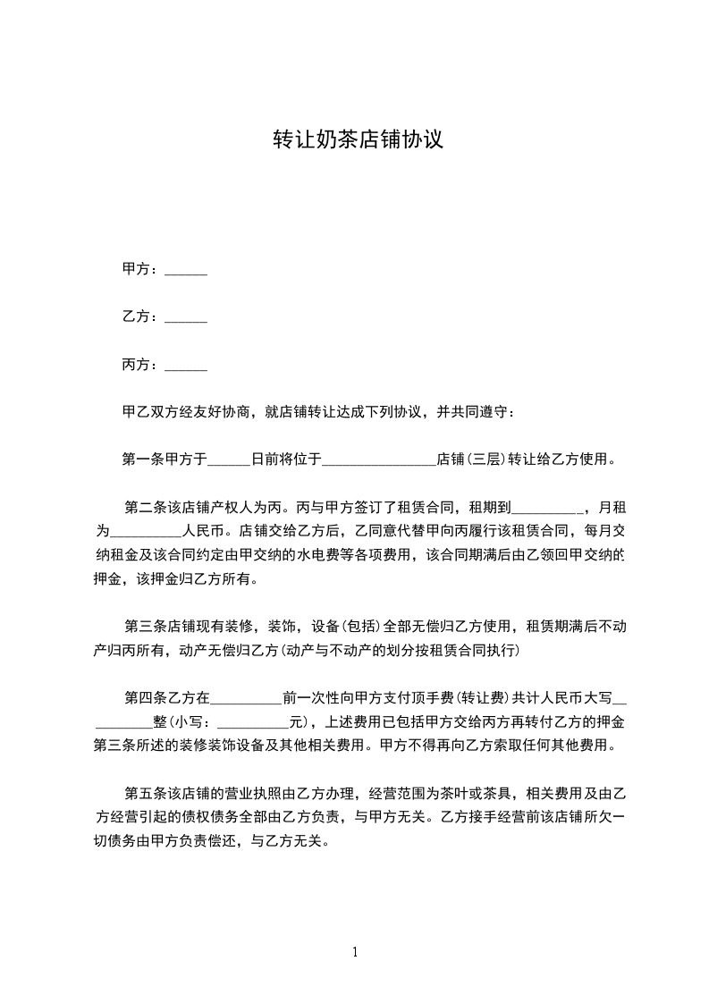 第二条该店铺产权人为丙。丙与甲方签订了租赁合同,租期到__________,月租为__________人民币。店铺交给乙方后,乙同意代替甲向丙履行该租赁合同,每月交纳租金及该合同约定由甲交纳的水电费等各项费用,该合同期满后由乙领回甲交纳的押金,该押金归乙方所有。