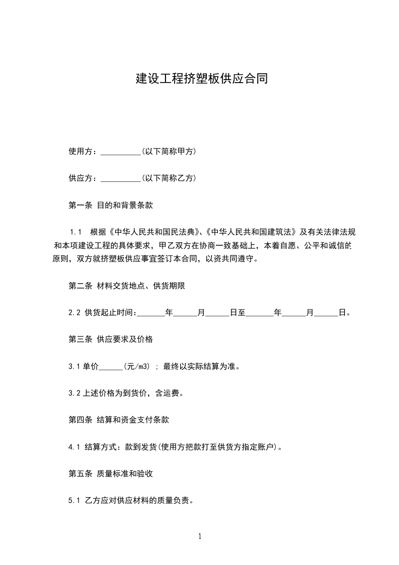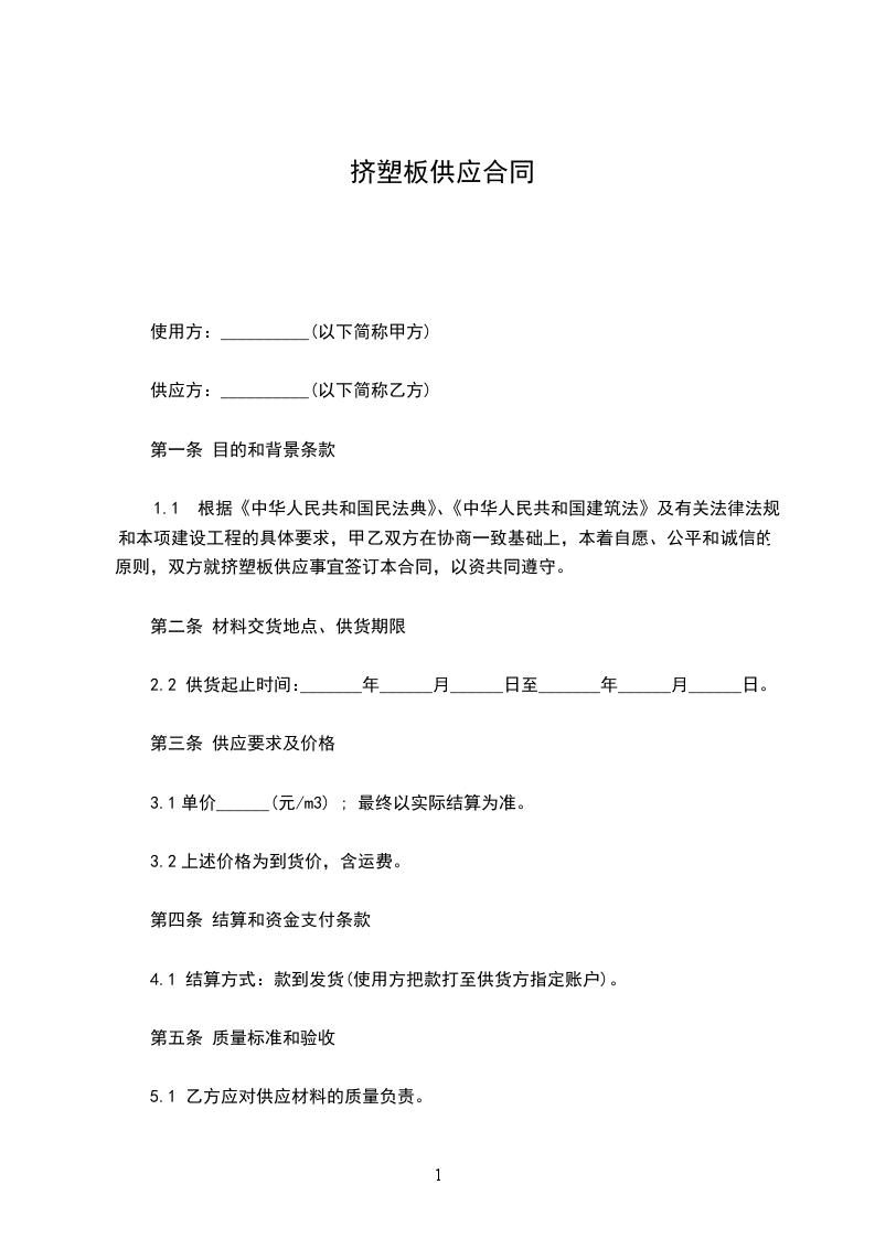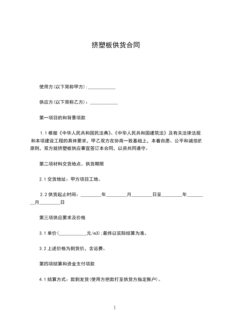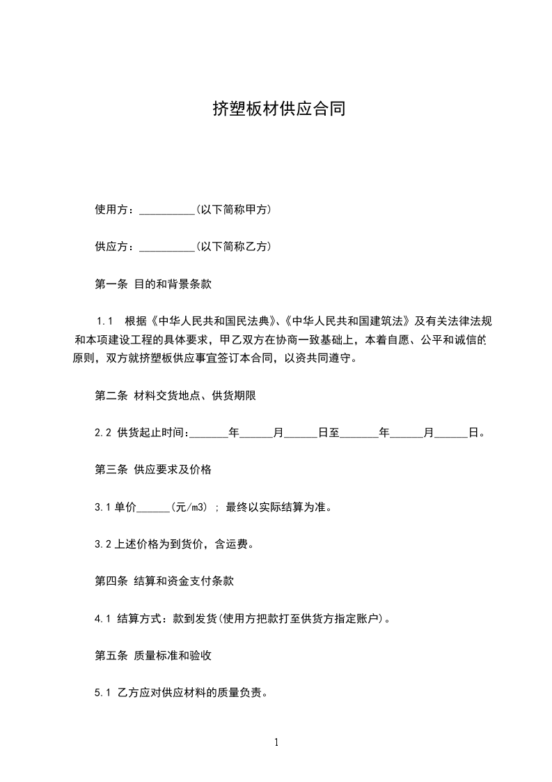 1.1根据《中华人民共和国民法典》、《中华人民共和国建筑法》及有关法律法规和本项建设工程的具体要求,甲乙双方在协商一致基础上,本着自愿、公平和诚信的原则,双方就挤塑板供应事宜签订本合同,以资共同遵守。
