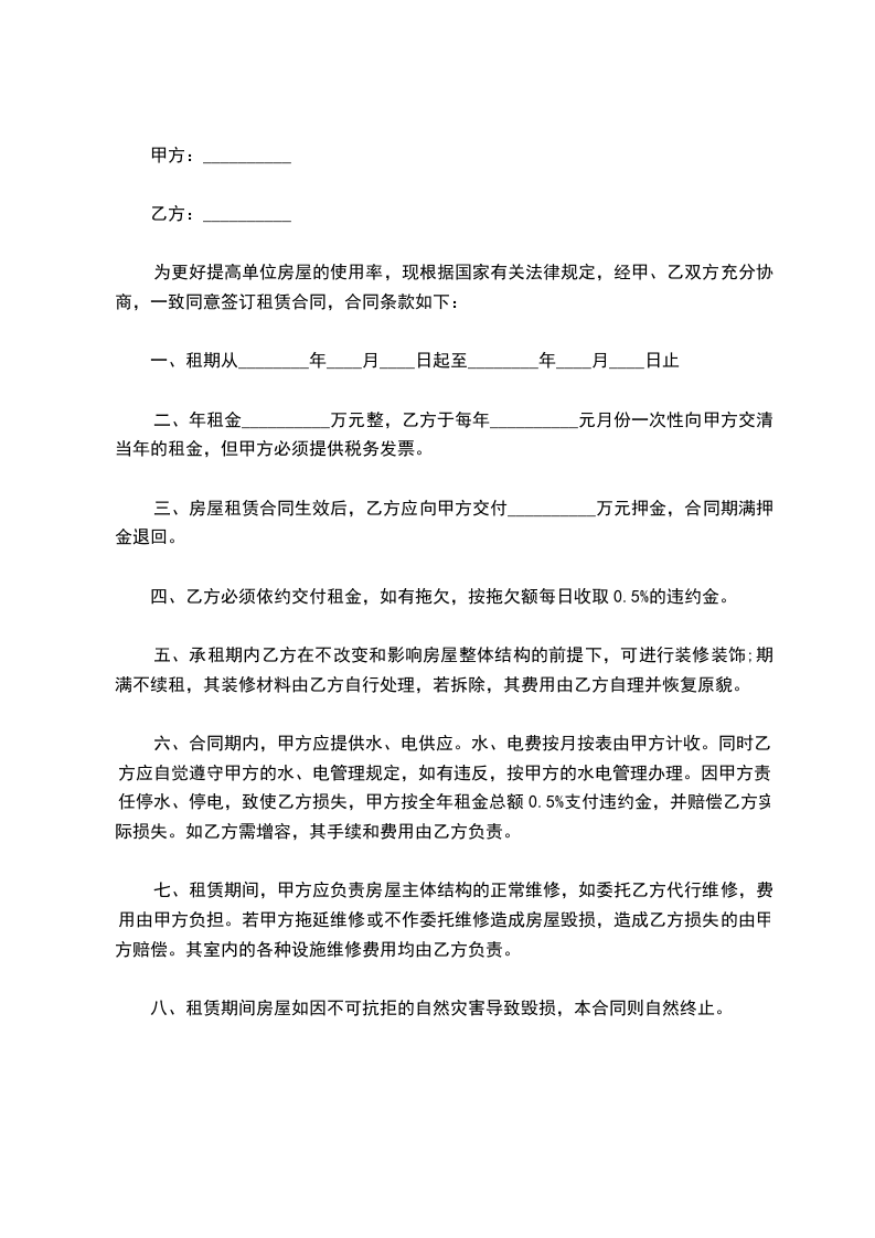 为更好提高单位房屋的使用率,现根据国家有关法律规定,经甲、乙双方充分协商,一致同意签订租赁合同,合同条款如下: