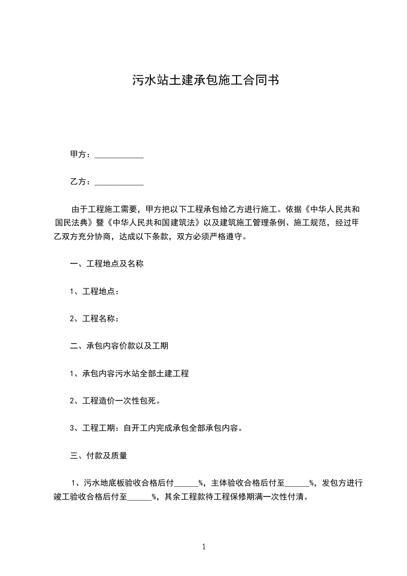 1、污水地底板验收合格后付______%,主体验收合格后付至______%,发包方进行竣工验收合格后付至______%,其余工程款待工程保修期满一次性付清。