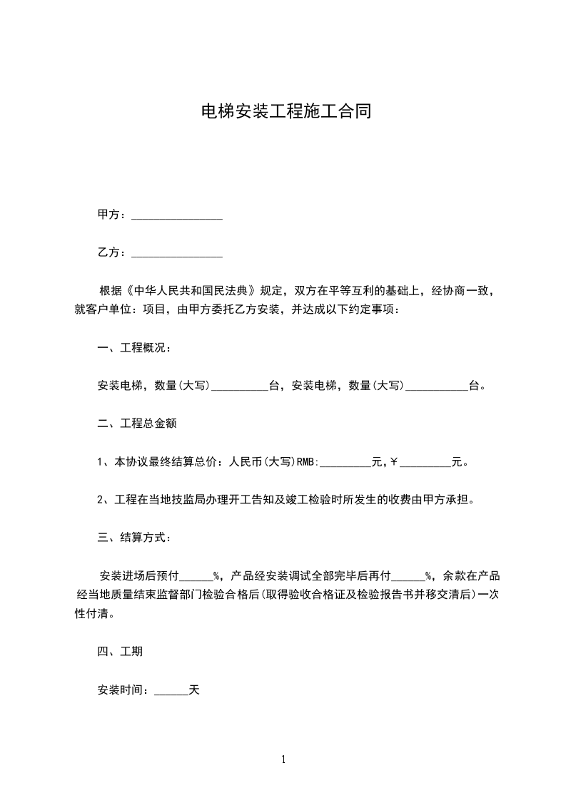 安装电梯,数量(大写)__________台,安装电梯,数量(大写)___________台。