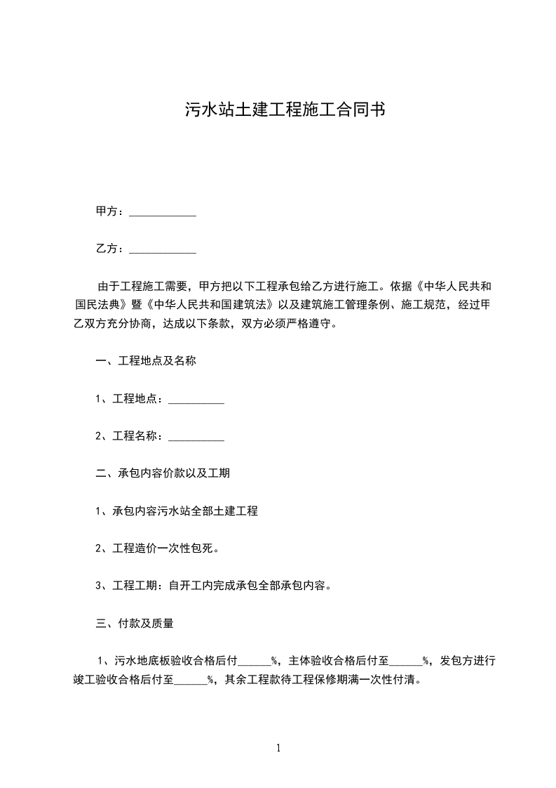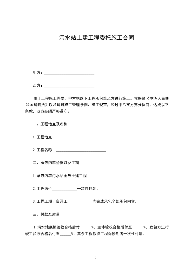 1、污水地底板验收合格后付______%,主体验收合格后付至______%,发包方进行竣工验收合格后付至______%,其余工程款待工程保修期满一次性付清。