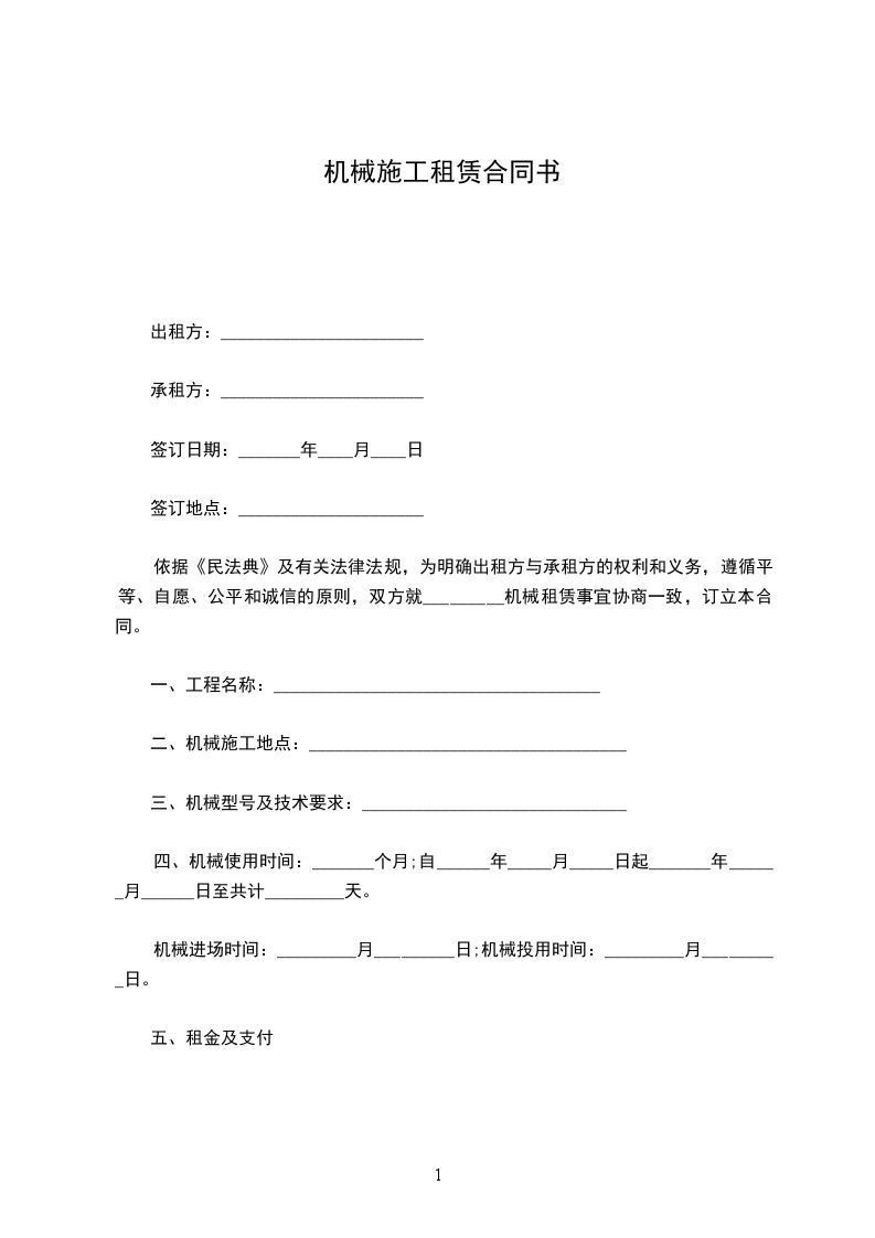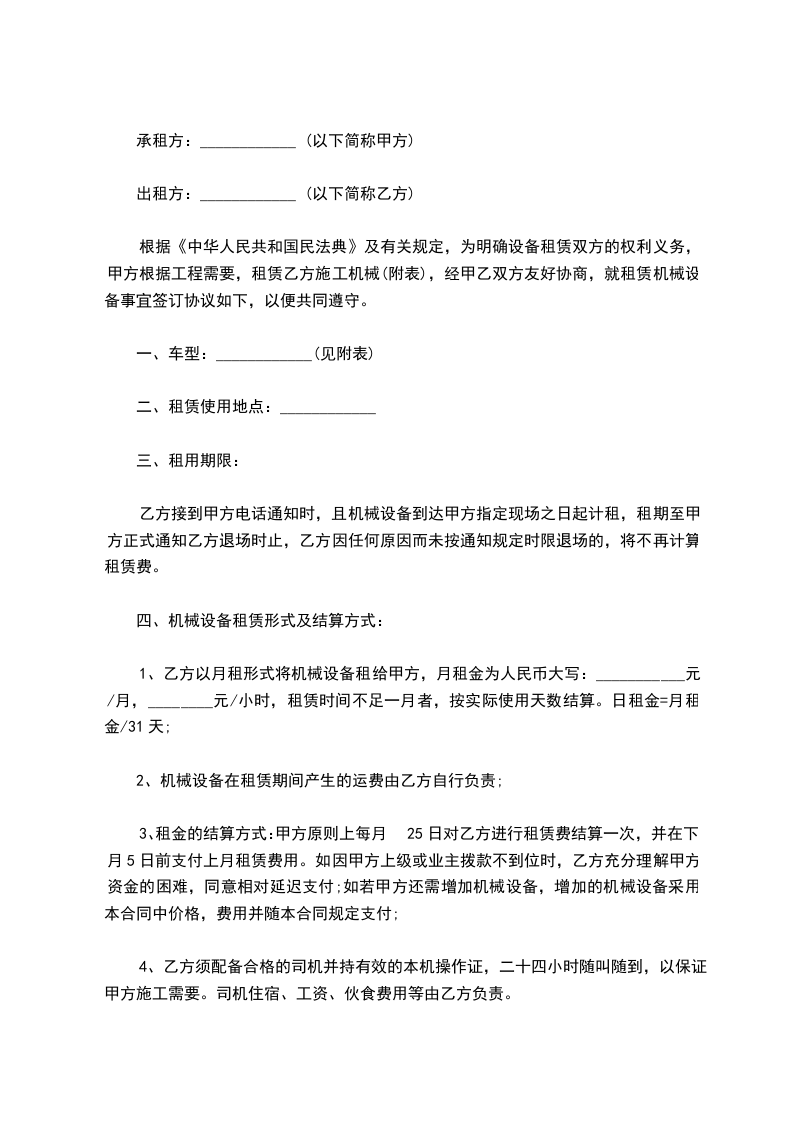 根据《民法典》,按照平等互利、自愿的原则,经双方协商一致,就工程机械租赁有关事项达成协议,签定本合同,双方愿共同遵守、履行: