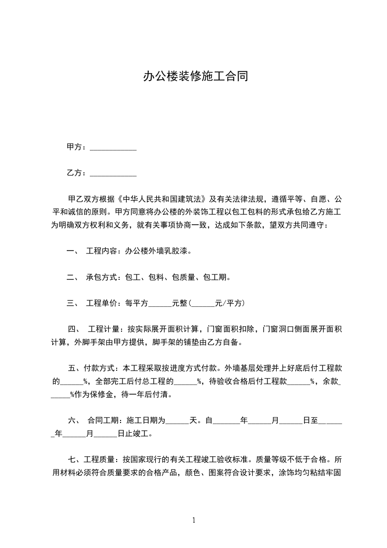 四、 工程计量:按实际展开面积计算,门窗面积扣除,门窗洞口侧面展开面积计算,外脚手架由甲方提供,脚手架的铺垫由乙方自备。