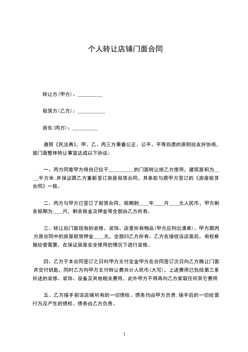 遵照《民法典》,甲、乙、丙三方秉着公正、公平、平等自愿的原则经友好协商,就门面整体转让事宜达成以下协议:
