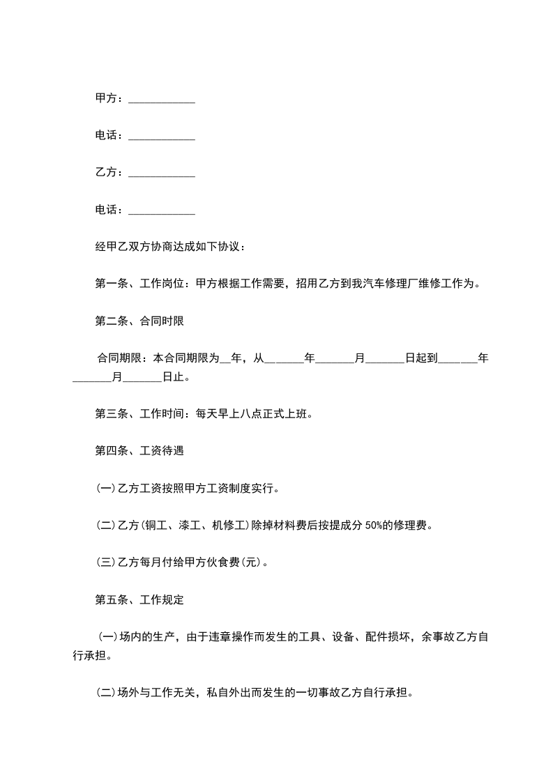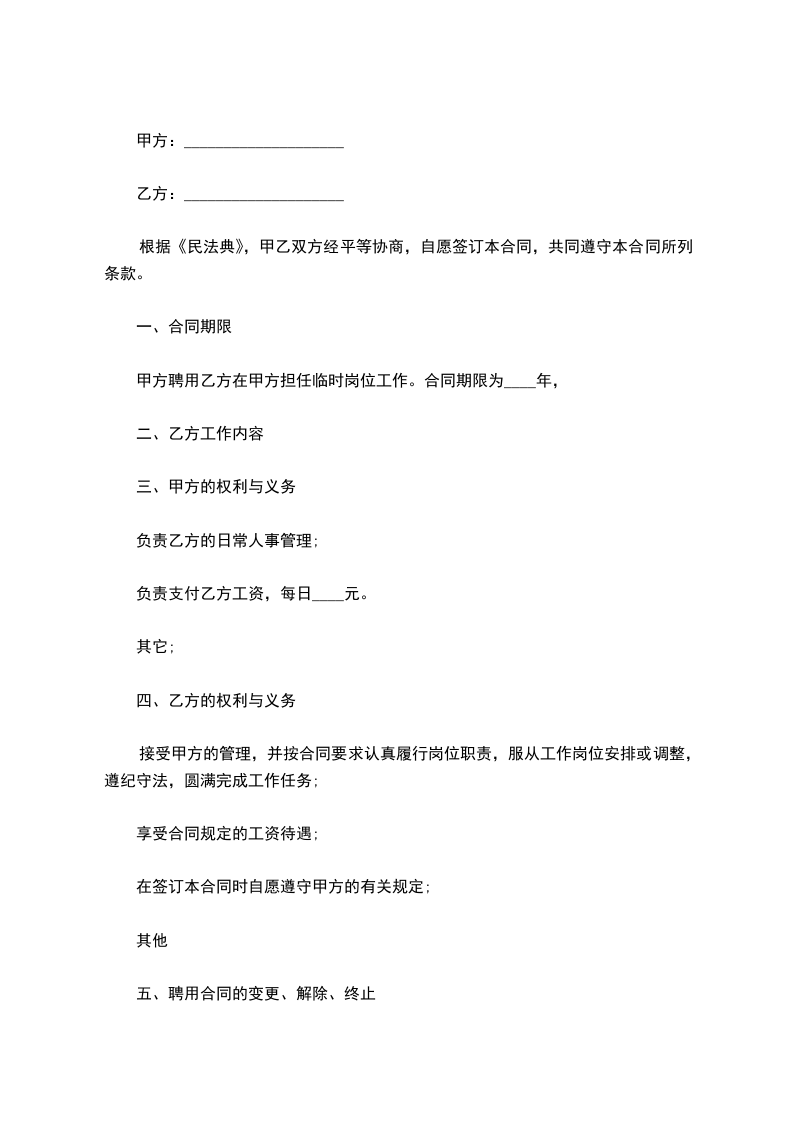 甲方聘用乙方在甲方担任临时岗位工作。合同期限为____年,
