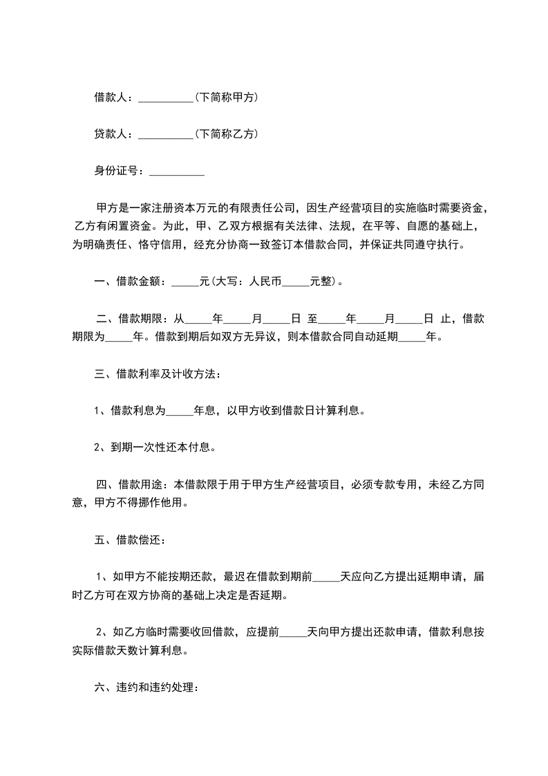 甲方是一家注册资本万元的有限责任公司,因生产经营项目的实施临时需要资金,乙方有闲置资金。为此,甲、乙双方根据有关法律、法规,在平等、自愿的基础上,为明确责任、恪守信用,经充分协商一致签订本借款合同,并保证共同遵守执行。