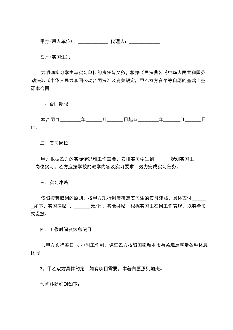 3、在实习期间,乙方不享受甲方员工依据《劳动合同》和甲方规章制度所享受的福利待遇。考虑到实习生的实际经济状况,解决实习生的生活困难,甲方根据具体情况和现有资源,给予实习生住宿和生活方面的补贴。