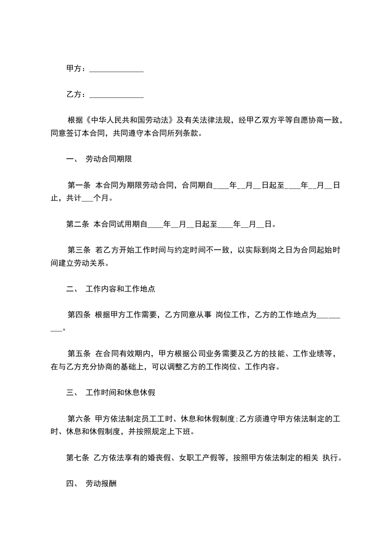 第一条 本合同为期限劳动合同,合同期自____年__月__日起至____年__月__日止,共计___个月。
