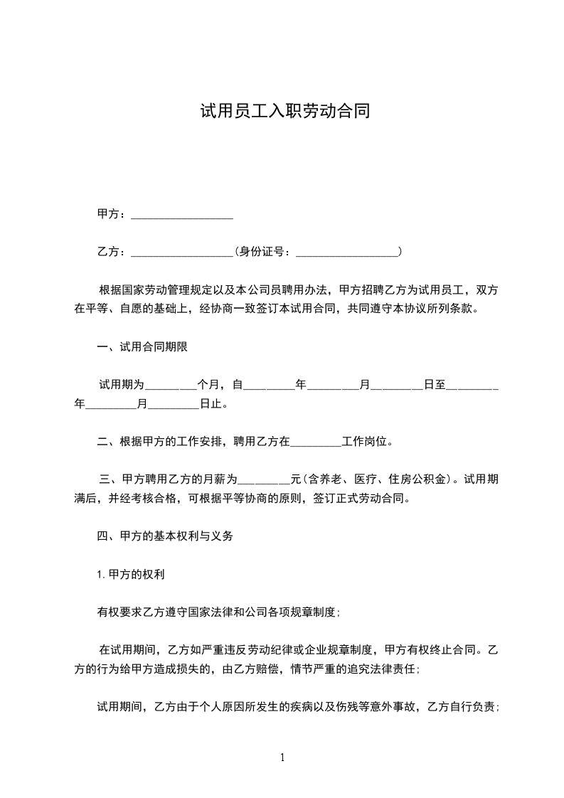 根据国家劳动管理规定以及本公司员聘用办法,甲方招聘乙方为试用员工,双方在平等、自愿的基础上,经协商一致签订本试用合同,共同遵守本协议所列条款。