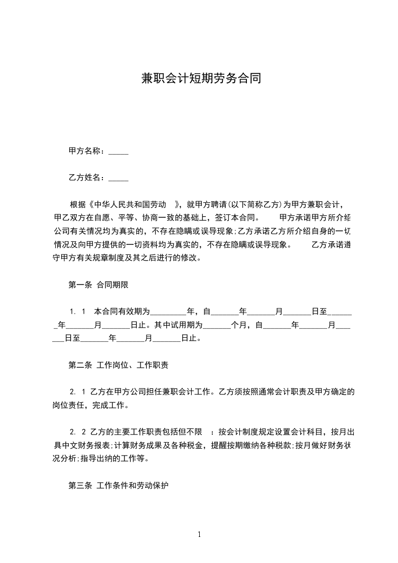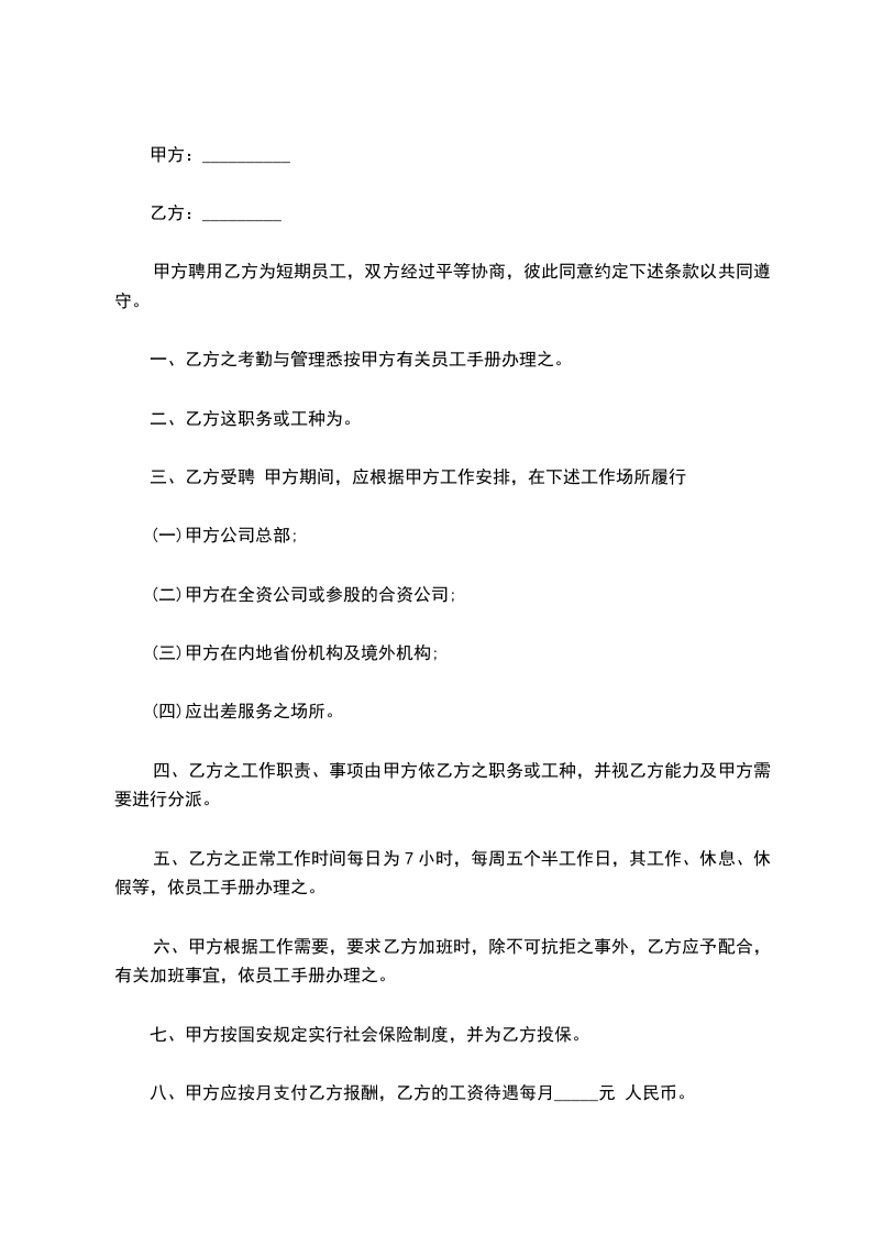 1、不足一个月时间的用工:从_______年_______月_______日至_______年_______月_______日(不设试用期)。