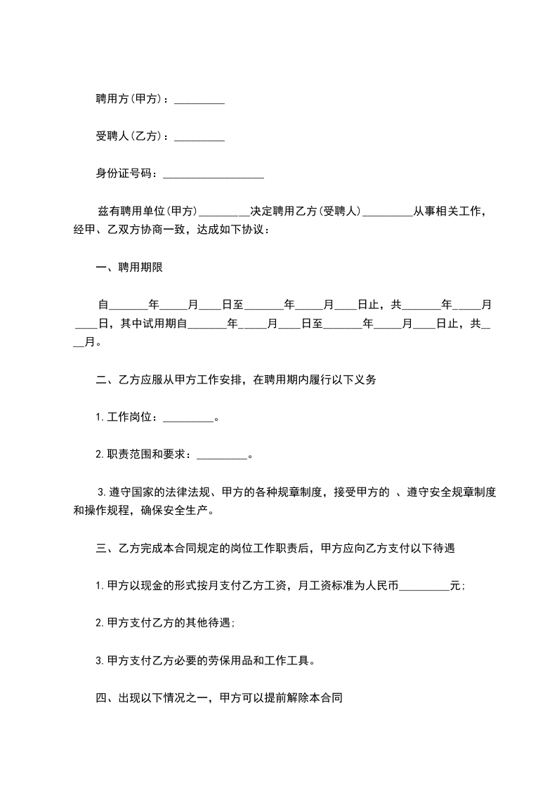兹有聘用单位(甲方)_________决定聘用乙方(受聘人)_________从事相关工作,经甲、乙双方协商一致,达成如下协议:
