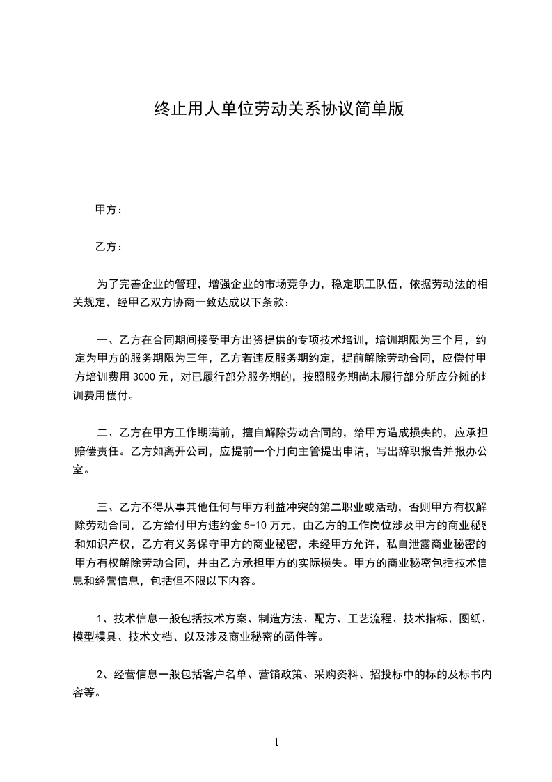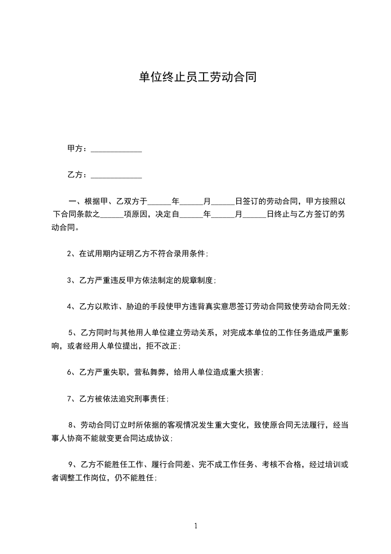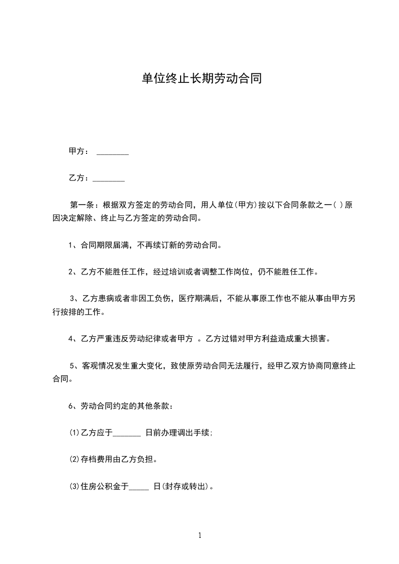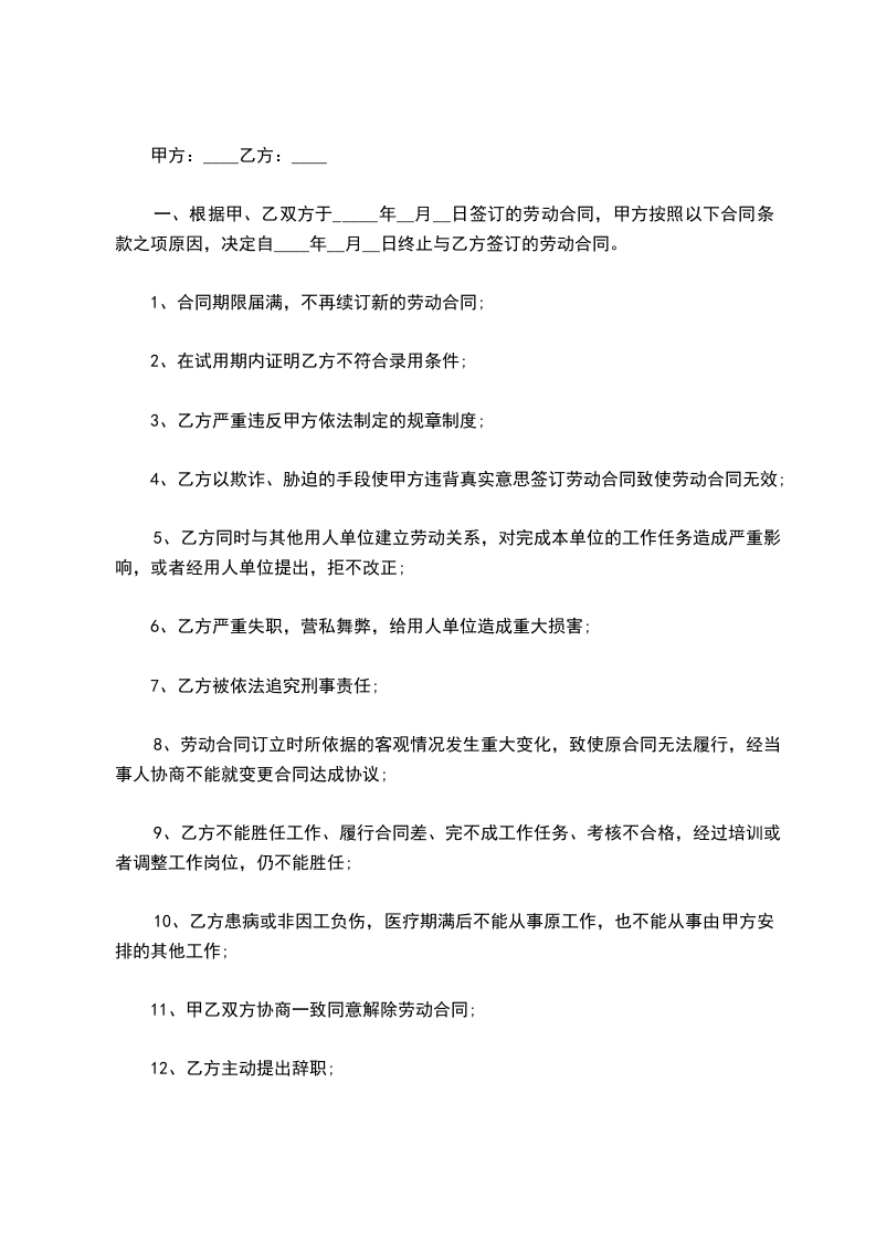 1、双方同意,自劳动合同届满日______年____月____日起,甲方终止与乙方签订的劳动合同,双方之间基于劳动关系的权利和义务随之终止。