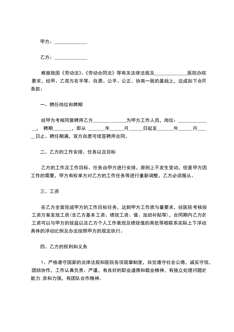 根据我国《劳动法》、《劳动合同法》等有关法律法规及______________医院办院要求,经甲、乙双方在平等、自愿、公平、公正、协商一致的基础上,达成如下合同条款: