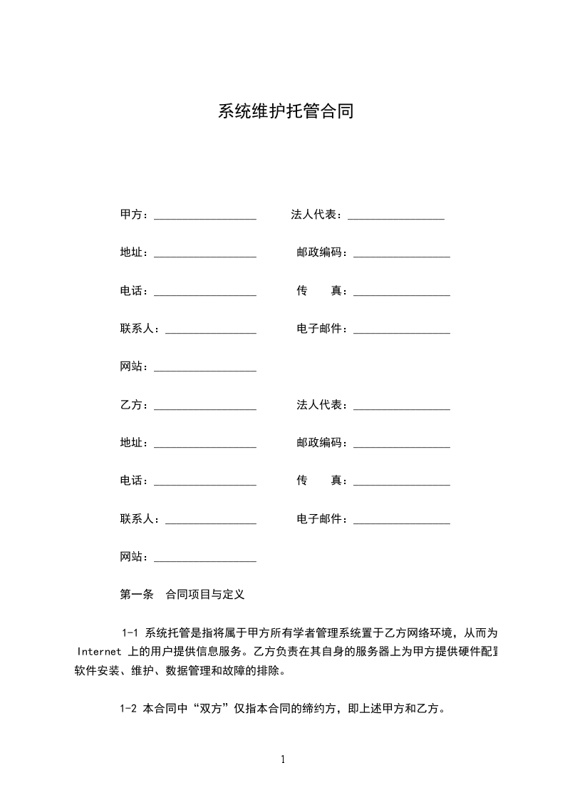 1-1 系统托管是指将属于甲方所有学者管理系统置于乙方网络环境,从而为Internet 上的用户提供信息服务。乙方负责在其自身的服务器上为甲方提供硬件配置,软件安装、维护、数据管理和故障的排除。