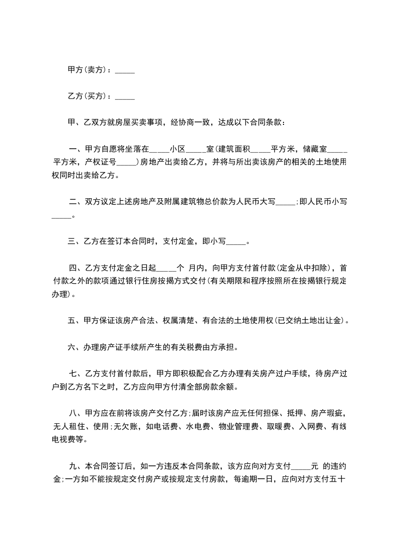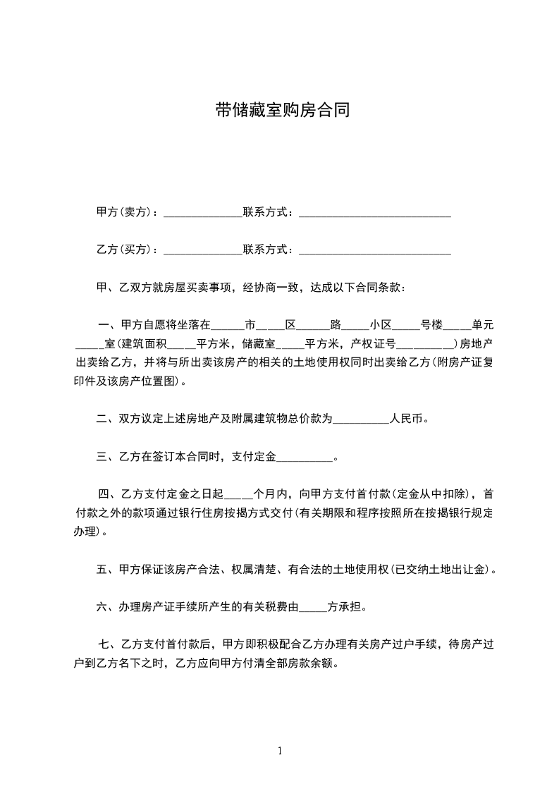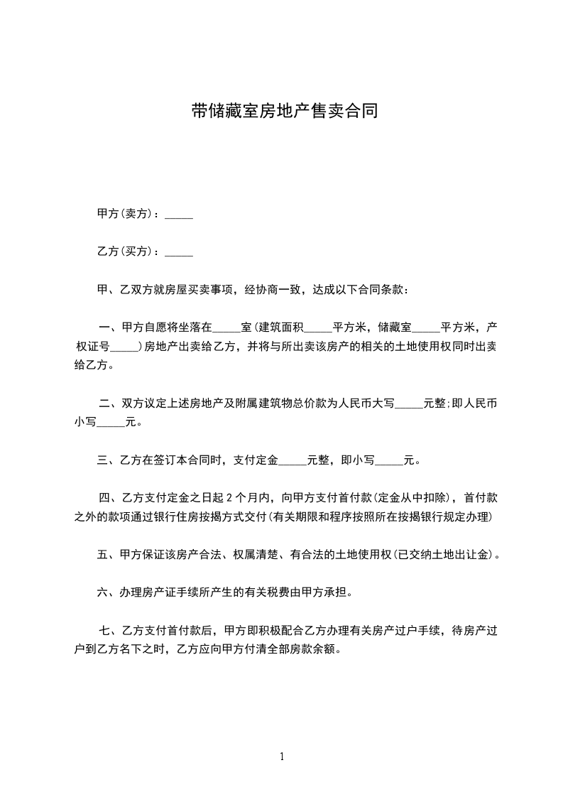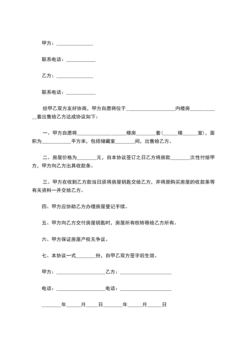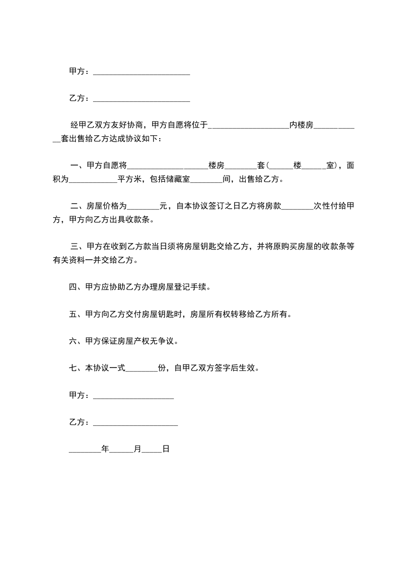 一、甲方自愿将____________________楼房________套(______楼______室),面积为____________平方米,包括储藏室________间,出售给乙方。