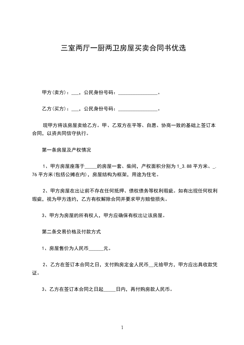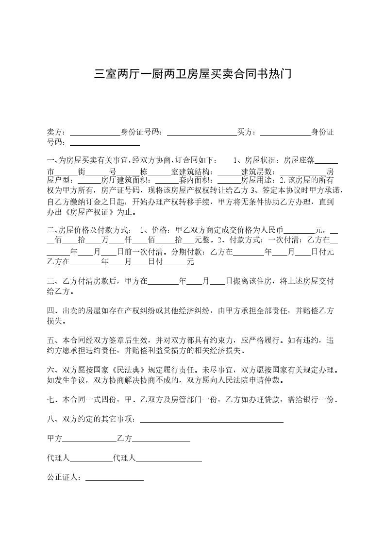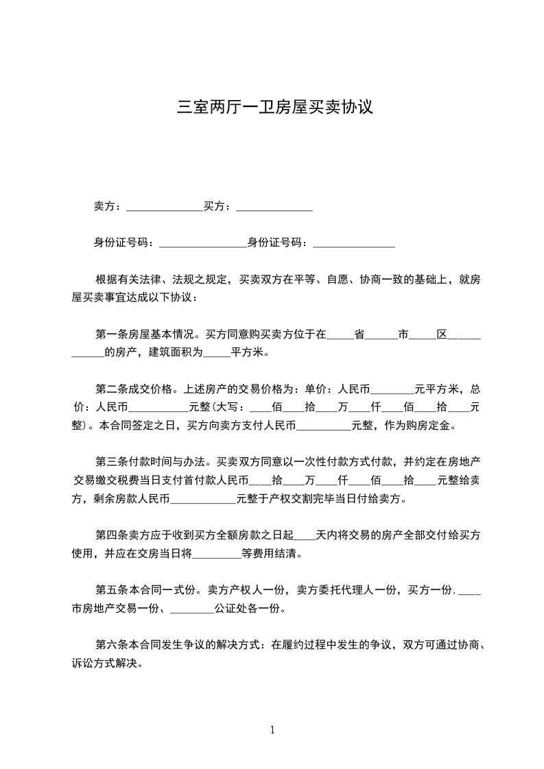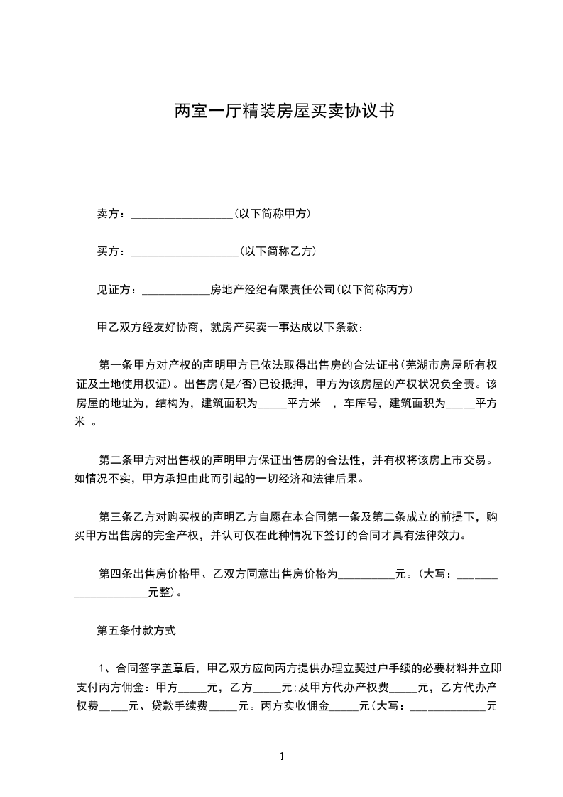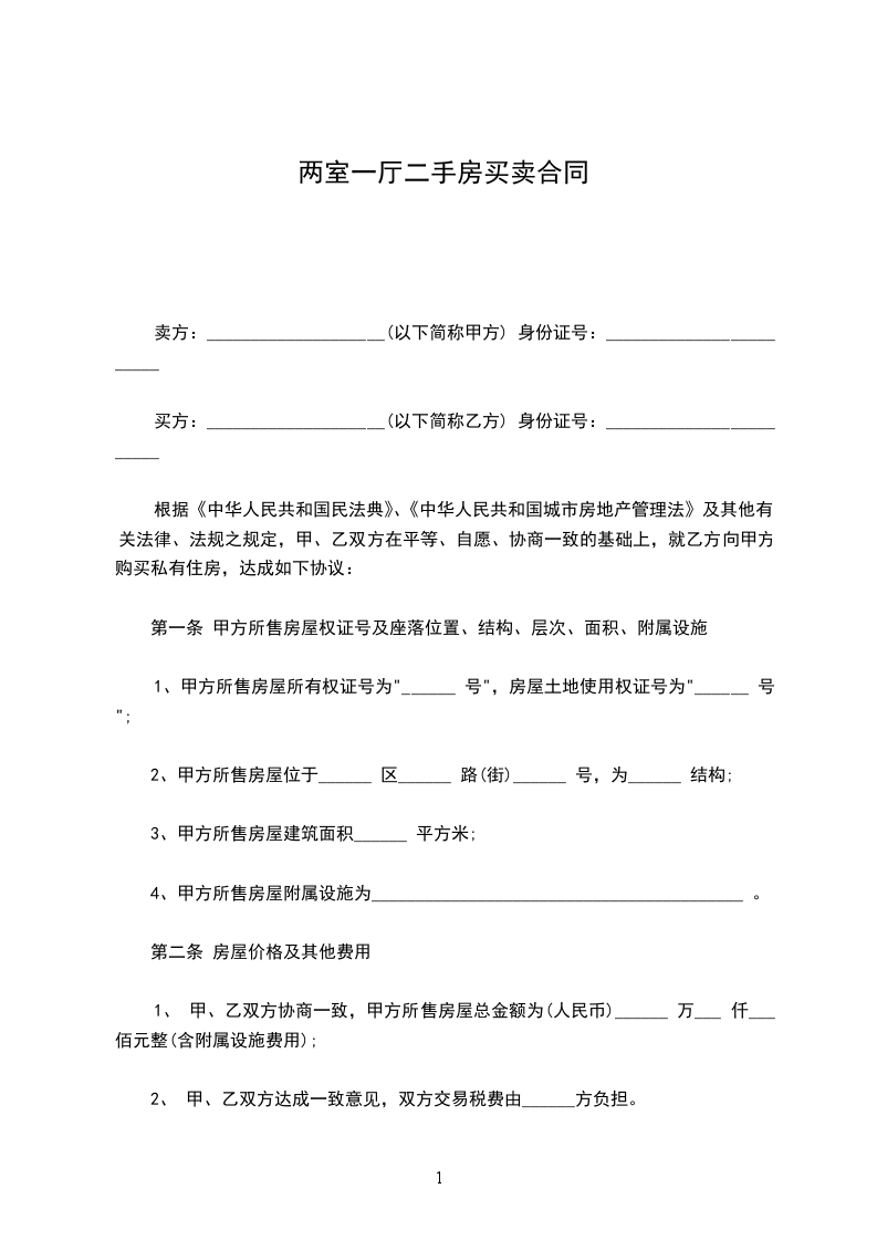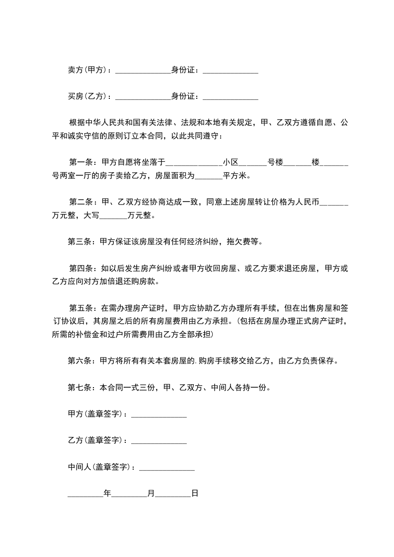 第一条:甲方自愿将坐落于______________小区_______号楼_______楼_______号两室一厅的房子卖给乙方,房屋面积为_______平方米。