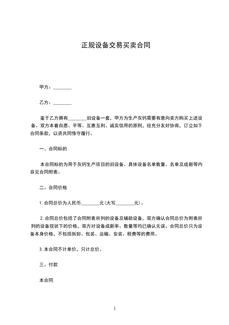 鉴于乙方拥有________旧设备一套,甲方为生产灰钙需要有意向卖方购买上述设备。双方本着自愿、平等、互惠互利、诚实信用的原则,经充分友好协商,订立如下合同条款,以资共同恪守履行。