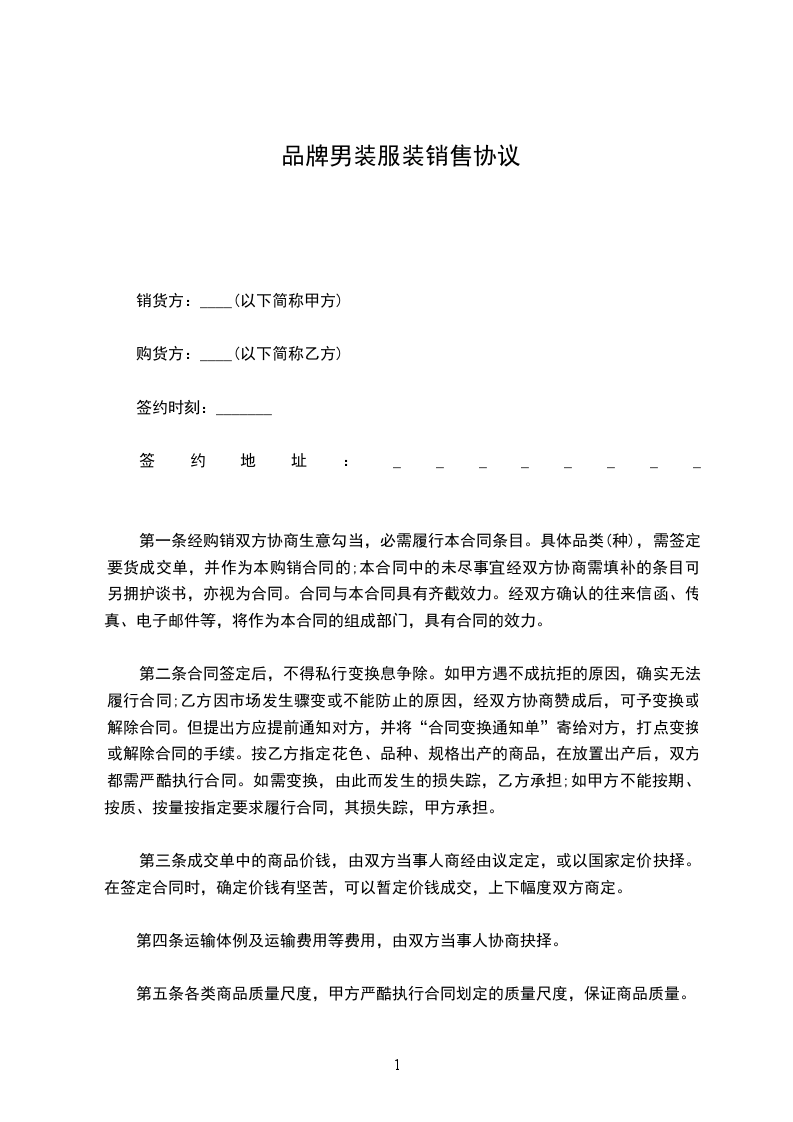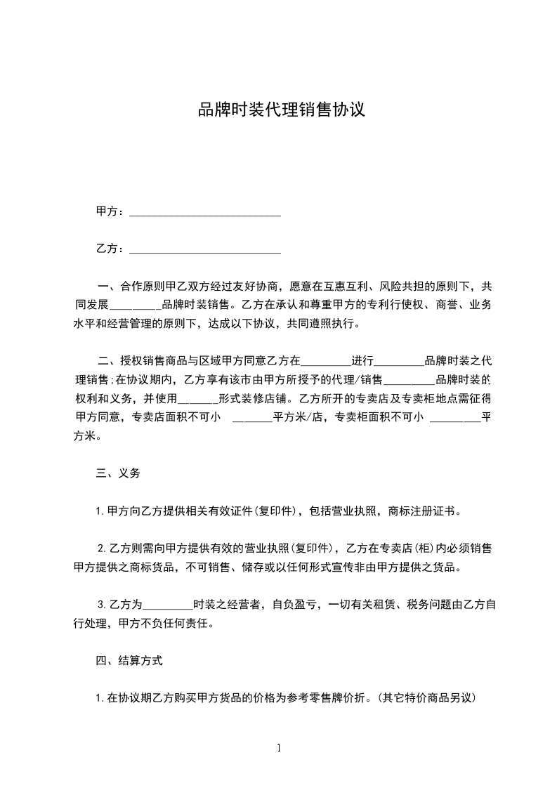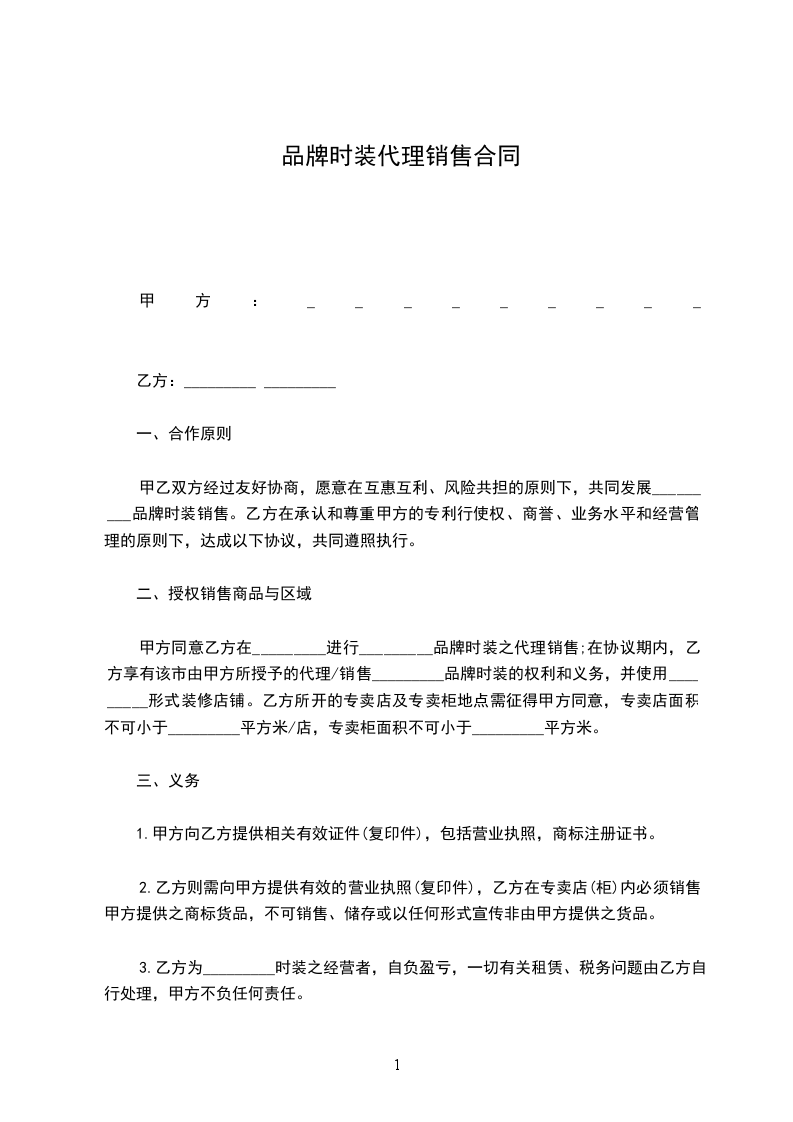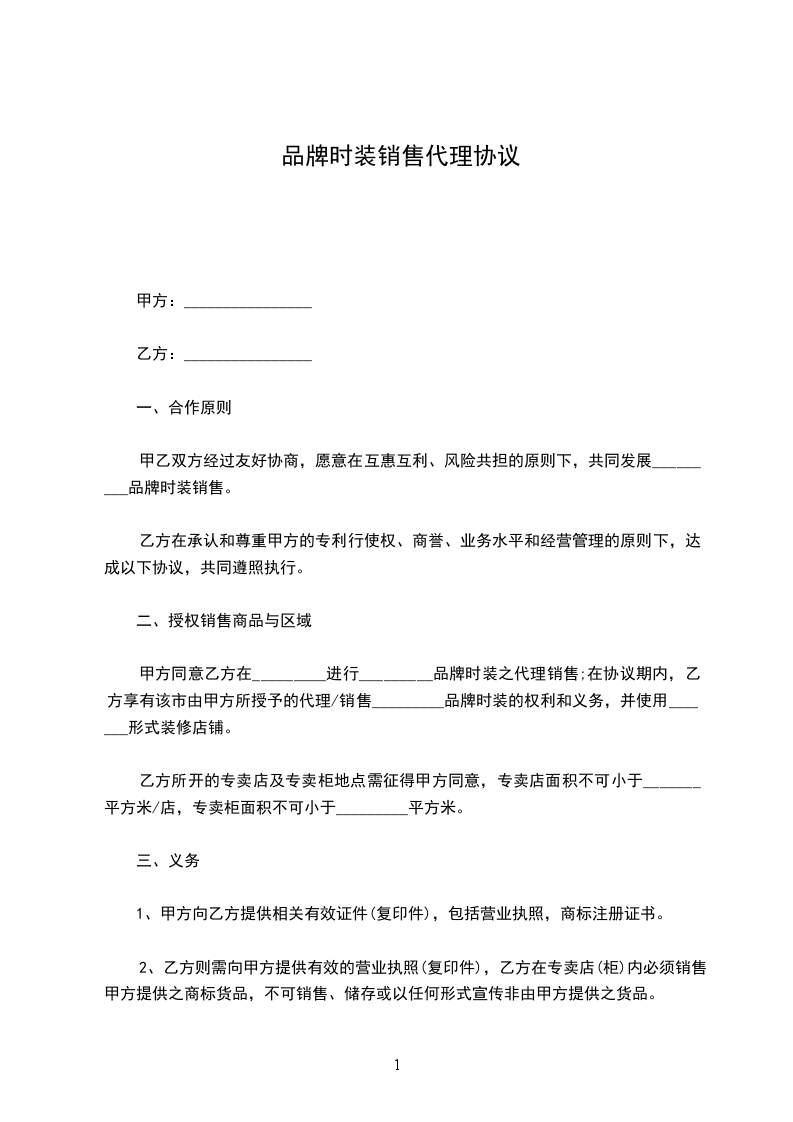 甲乙双方经过友好协商,愿意在互惠互利、风险共担的原则下,共同发展_________品牌时装销售。乙方在承认和尊重甲方的专利行使权、商誉、业务水平和经营管理的原则下,达成以下协议,共同遵照执行。