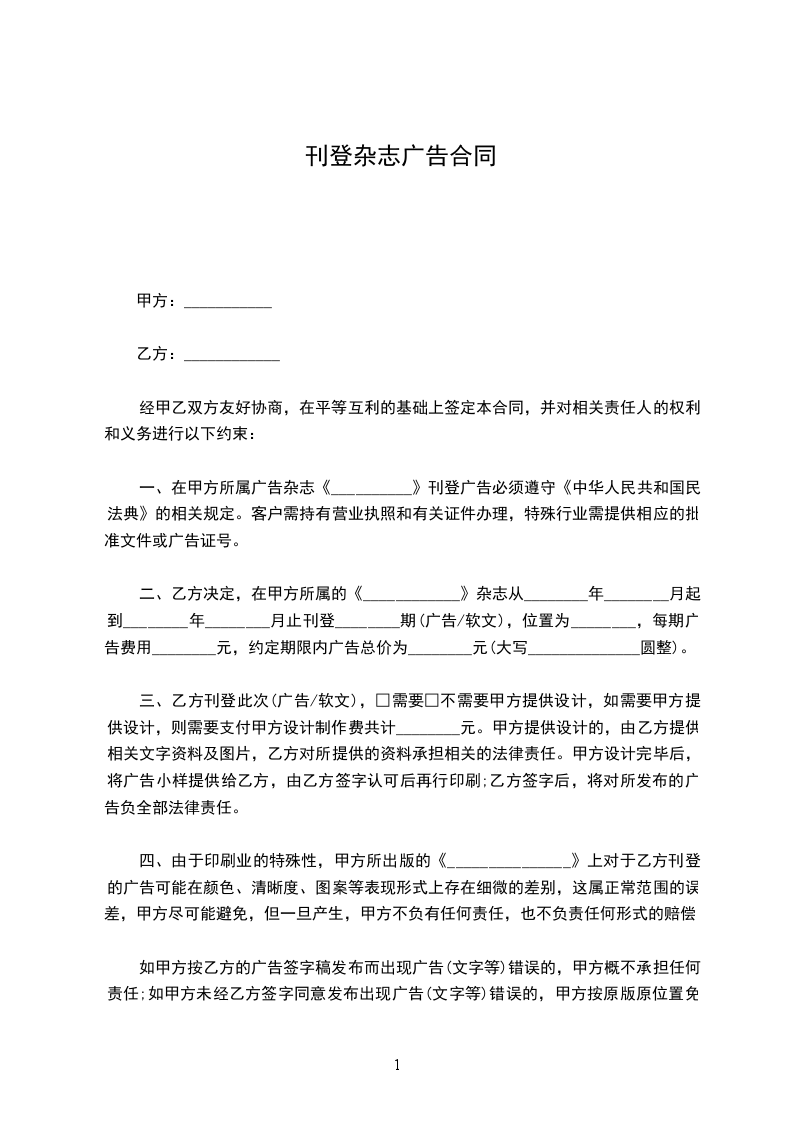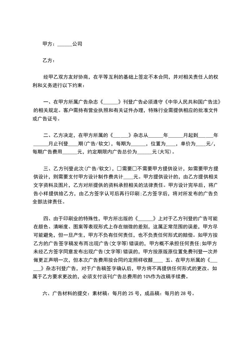 1.甲方为乙方提供《______________》广告版面,版面按协议月度安排:每月提供不少于__________个版面;如有特殊广告版面要求,应提前一周向甲方申报。