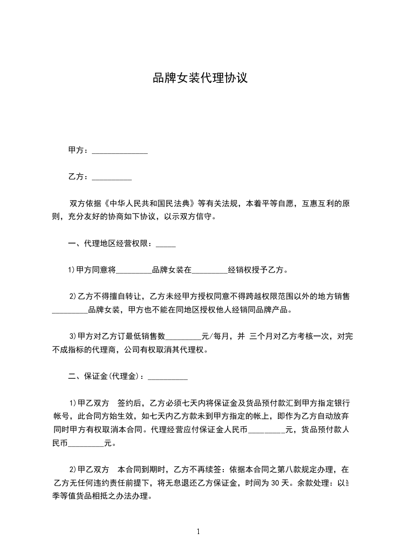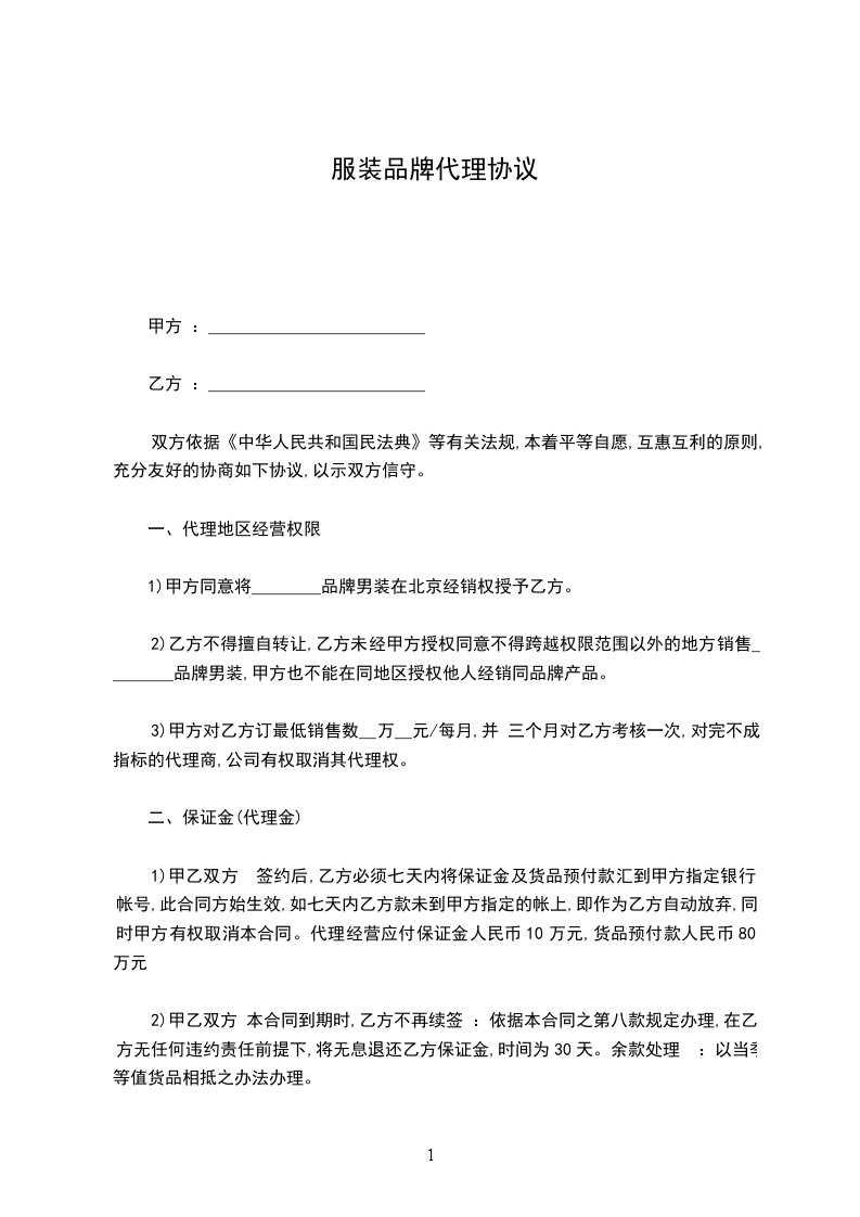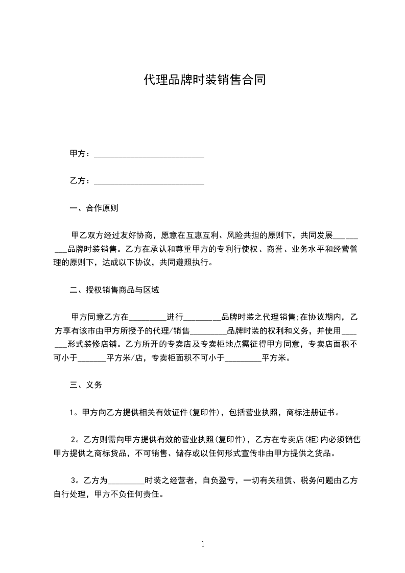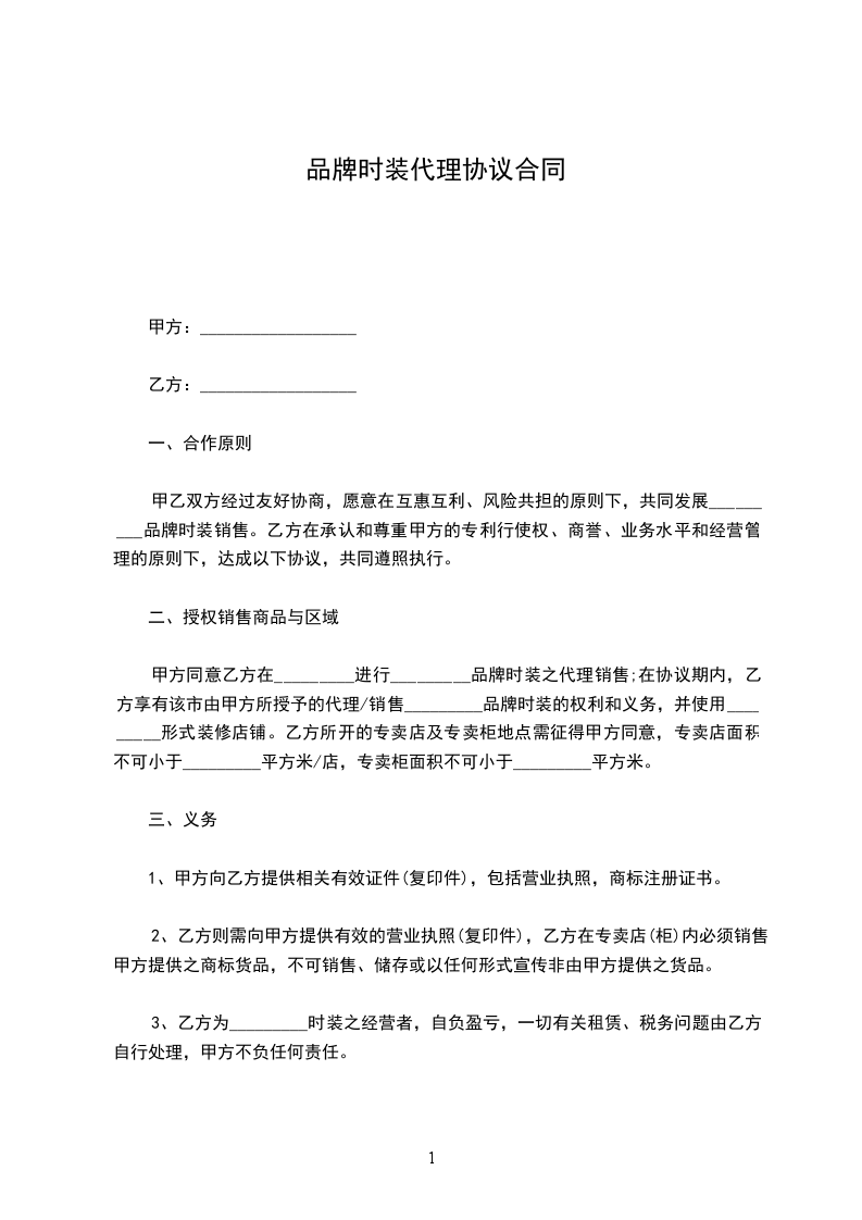 甲乙双方经过友好协商,愿意在互惠互利、风险共担的原则下,共同发展_________品牌时装销售。乙方在承认和尊重甲方的专利行使权、商誉、业务水平和经营管理的原则下,达成以下协议,共同遵照执行。