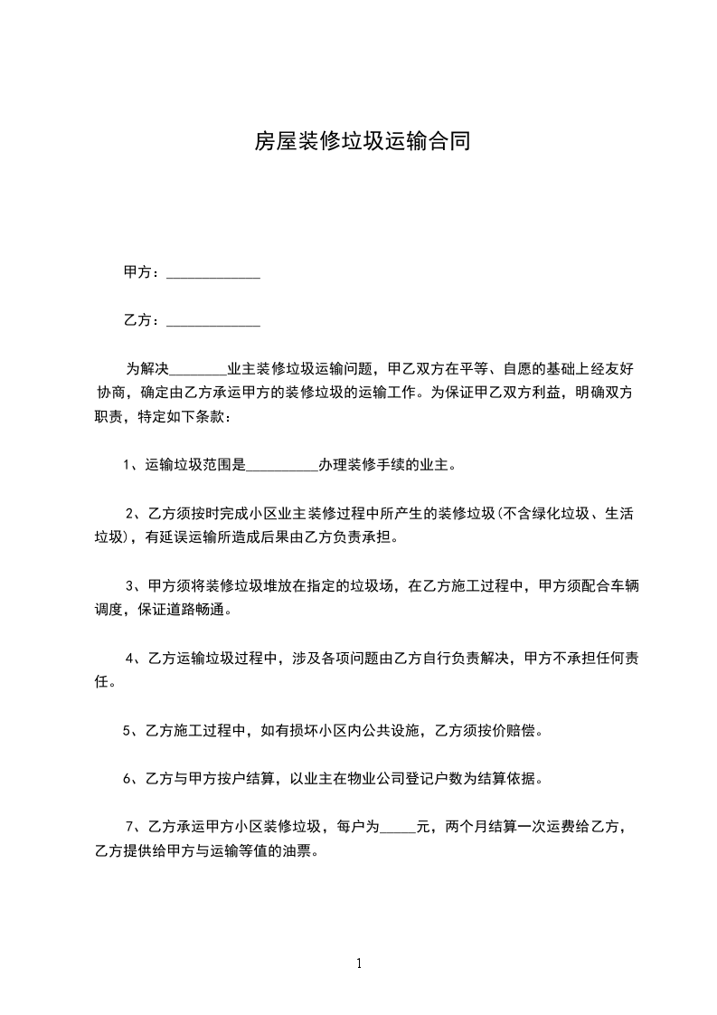 7、乙方承运甲方小区装修垃圾,每户为_____元,两个月结算一次运费给乙方,乙方提供给甲方与运输等值的油票。