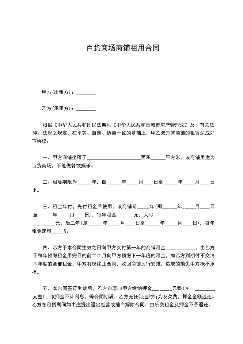 一、甲方商铺坐落于______________________面积______平方米,该商铺用途为百货商场,不能做餐饮娱乐。