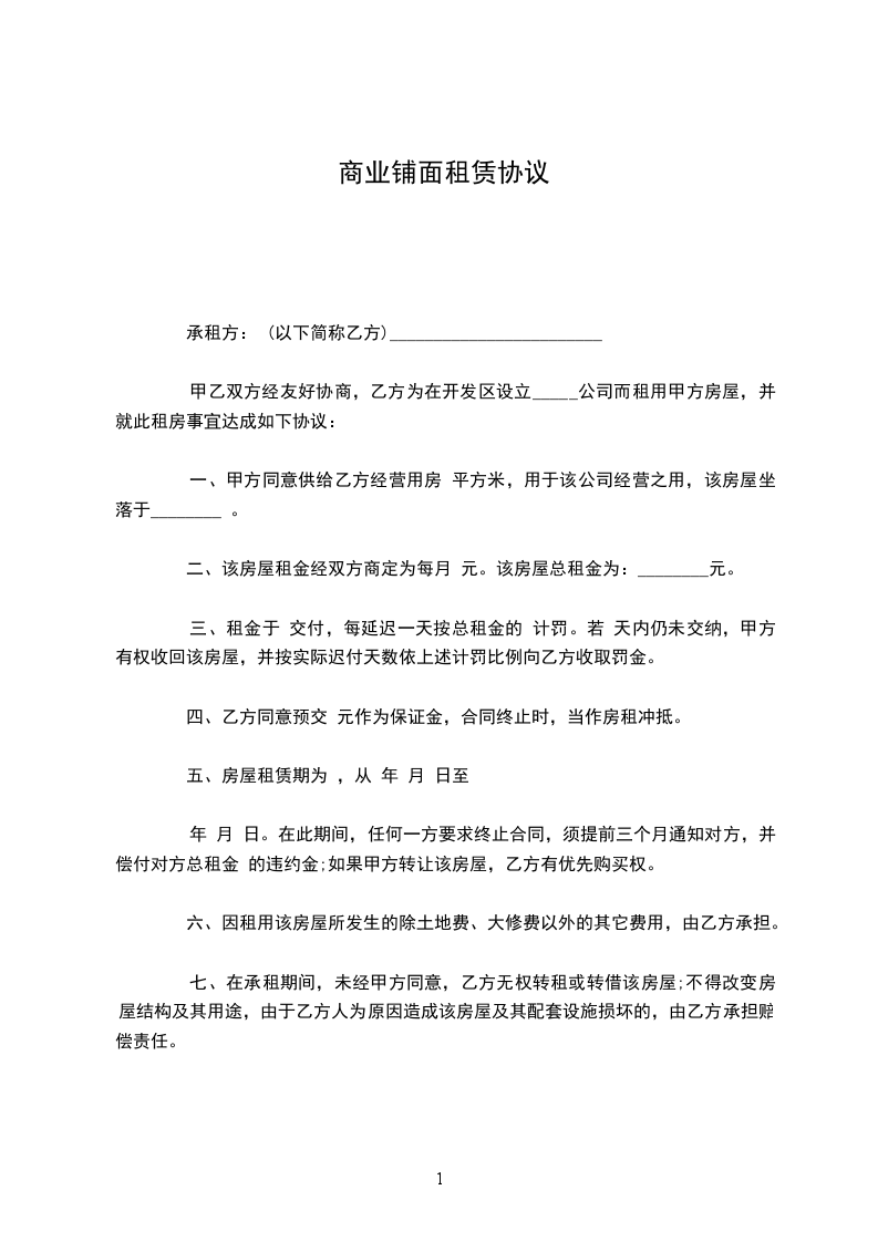 甲乙双方通过友好协商,就商铺租赁事宜达成如下协议: