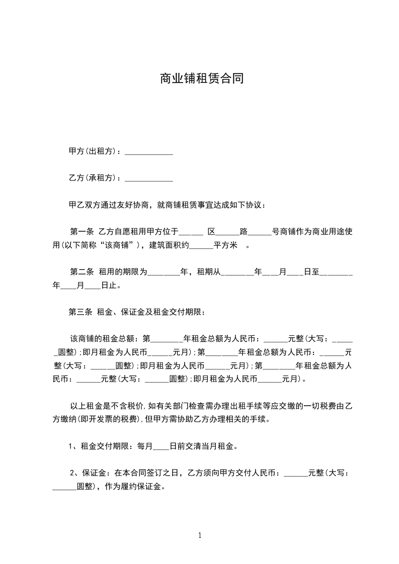 第一条 乙方自愿租用甲方位于______ 区______路______号商铺作为商业用途使用(以下简称“该商铺”),建筑面积约______平方米 。
