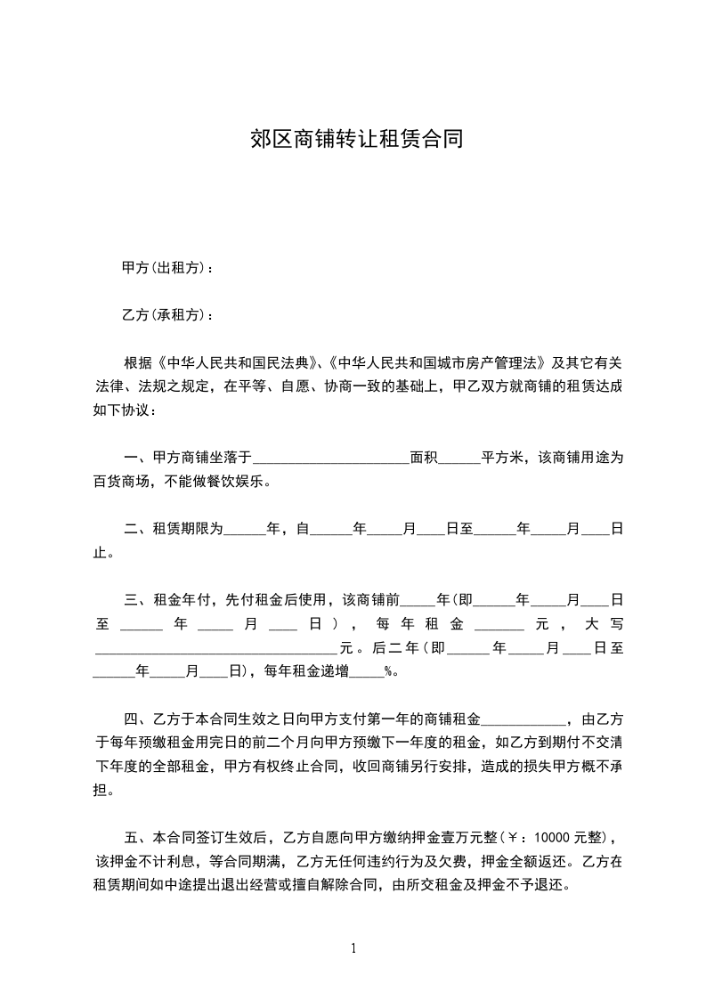 9、合同签订时,乙方需向甲方交纳此商铺押金¥_____元(壹仟元整),押金不得冲抵商铺租金。租赁期满或合同解除后,乙方将该商铺及其附属设施移交甲方并交清相关费用后,甲方全额无息返还乙方交付的相应押金。