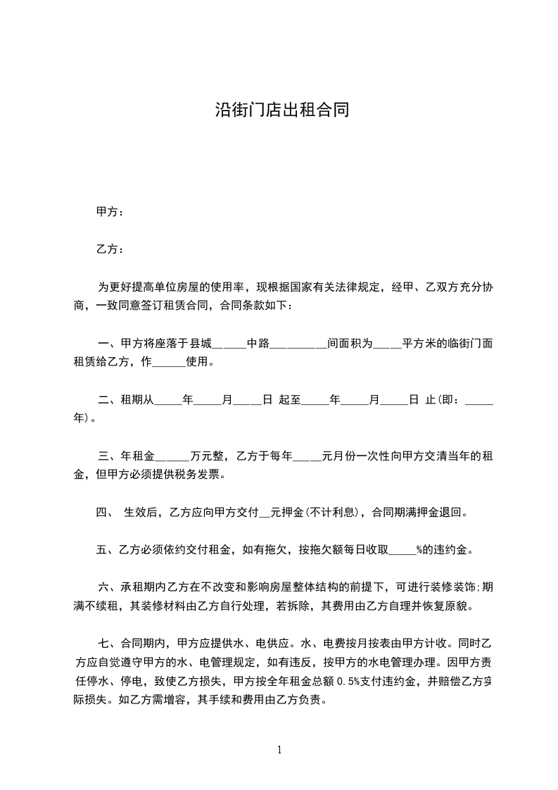 一、甲方将座落于县城______中路__________间面积为_____平方米的临街门面租赁给乙方,作______使用。