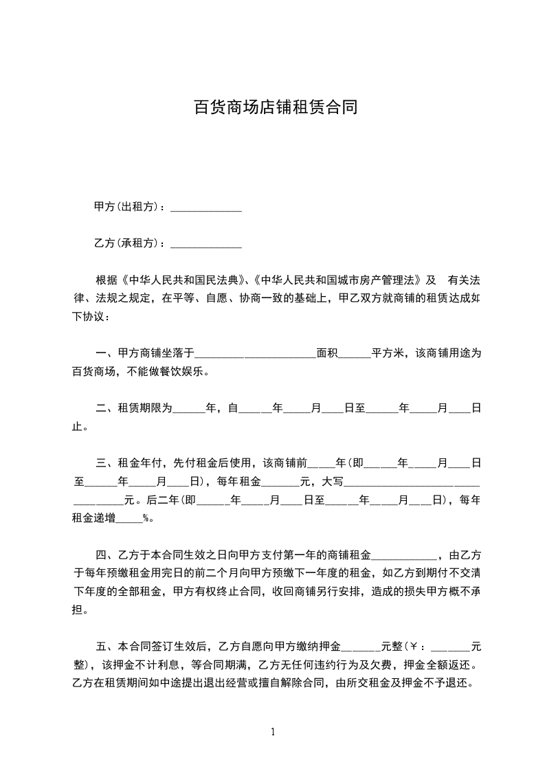 一、甲方商铺坐落于______________________面积______平方米,该商铺用途为百货商场,不能做餐饮娱乐。