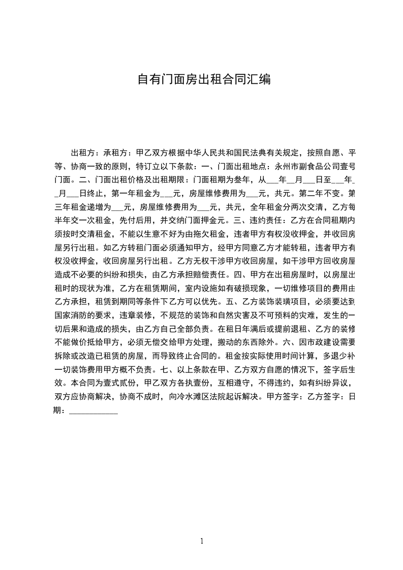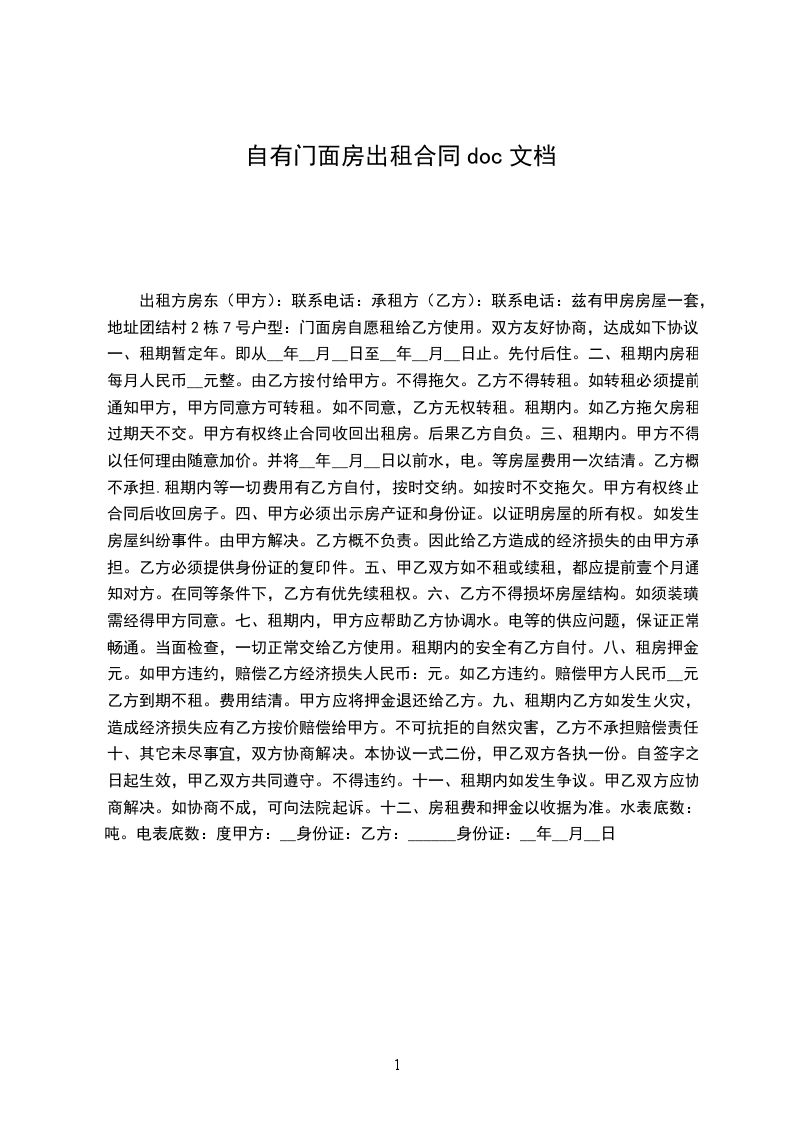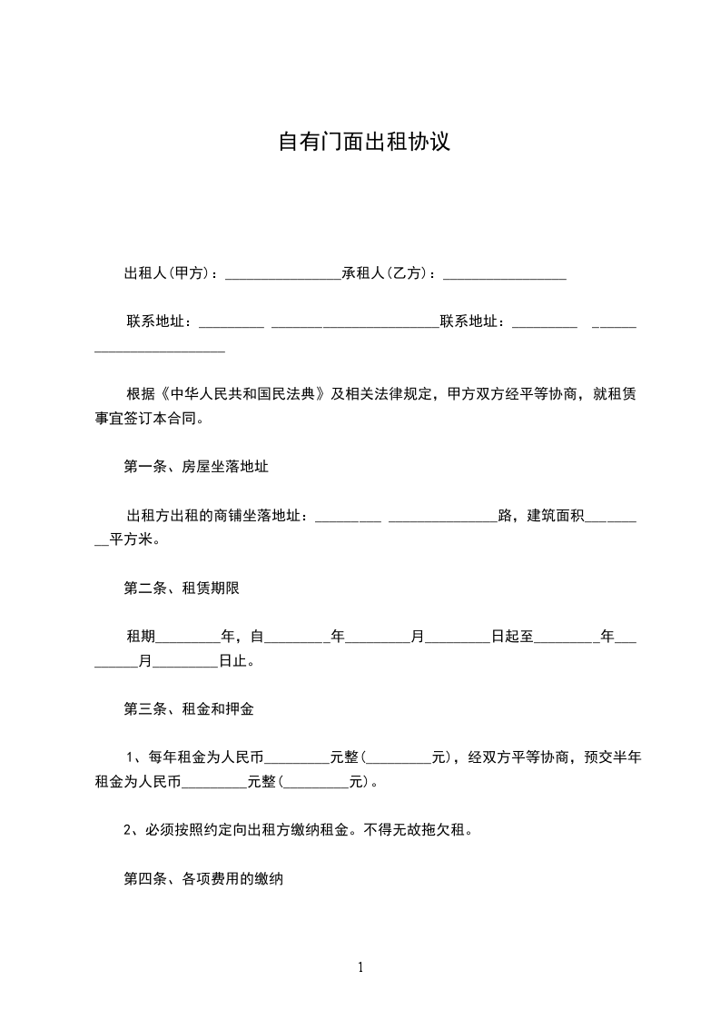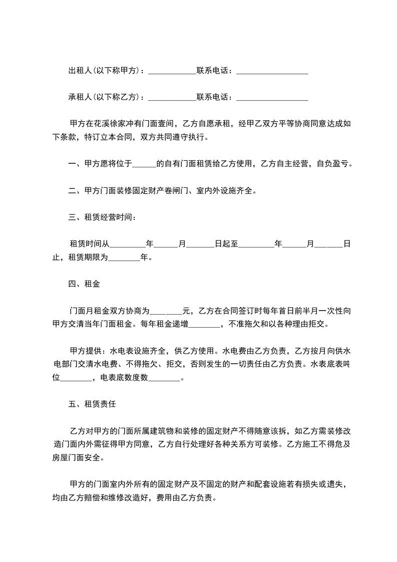 一、甲方愿将位于______的自有门面租赁给乙方使用,乙方自主经营,自负盈亏。
