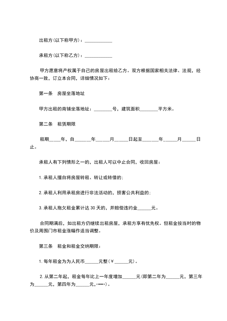 一、甲方将座落于_______大楼_______楼一间面积为_______平方米的临街门面租赁给乙方,作为_______店使用。