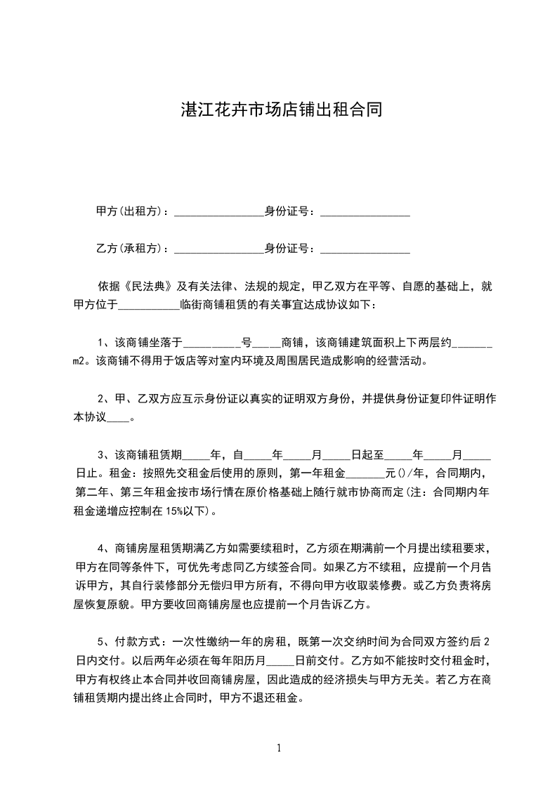 3、该商铺租赁期_____年,自_____年_____月_____日起至_____年_____月_____日止。租金:按照先交租金后使用的原则,第一年租金_______元()/年,合同期内,第二年、第三年租金按市场行情在原价格基础上随行就市协商而定(注:合同期内年租金递增应控制在15%以下)。