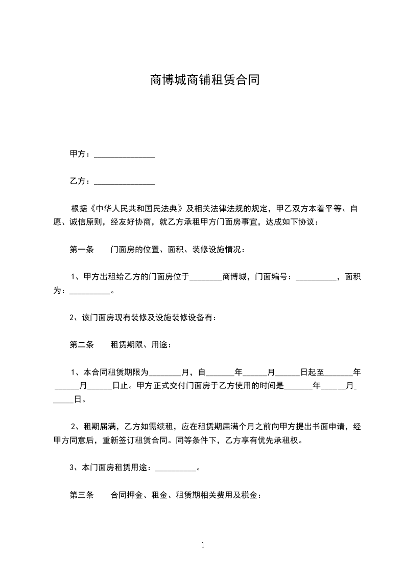 1、甲方出租给乙方的门面房位于________商博城,门面编号:__________,面积为:__________。