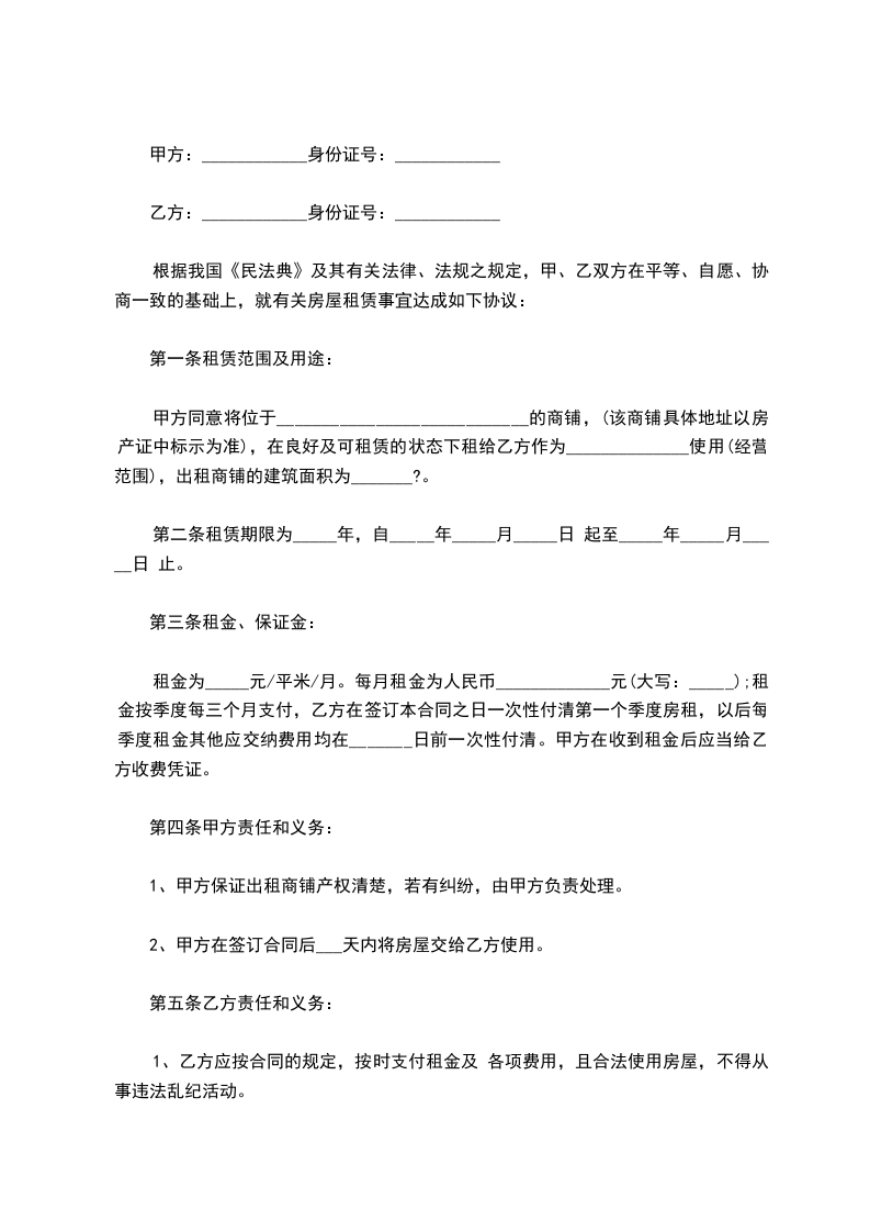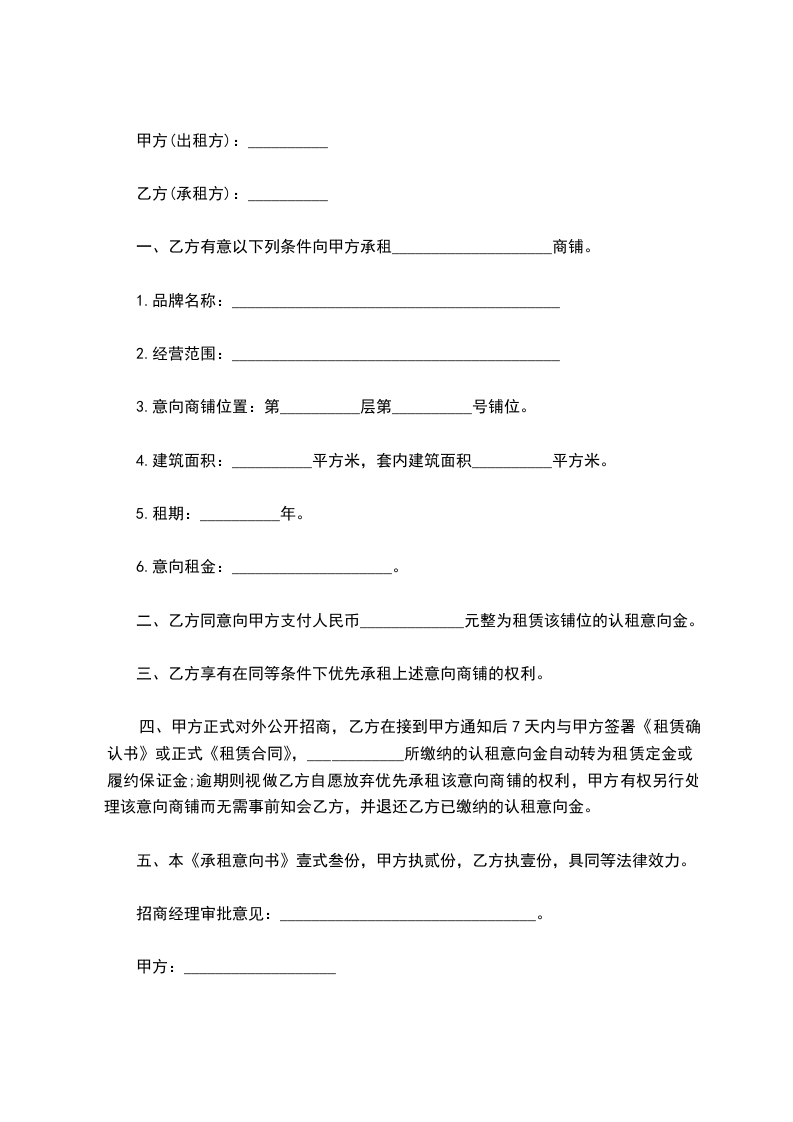 甲方同意将位于____________________________的商铺,(该商铺具体地址以房产证中标示为准),在良好及可租赁的状态下租给乙方作为______________使用(经营范围),出租商铺的建筑面积为_______?。