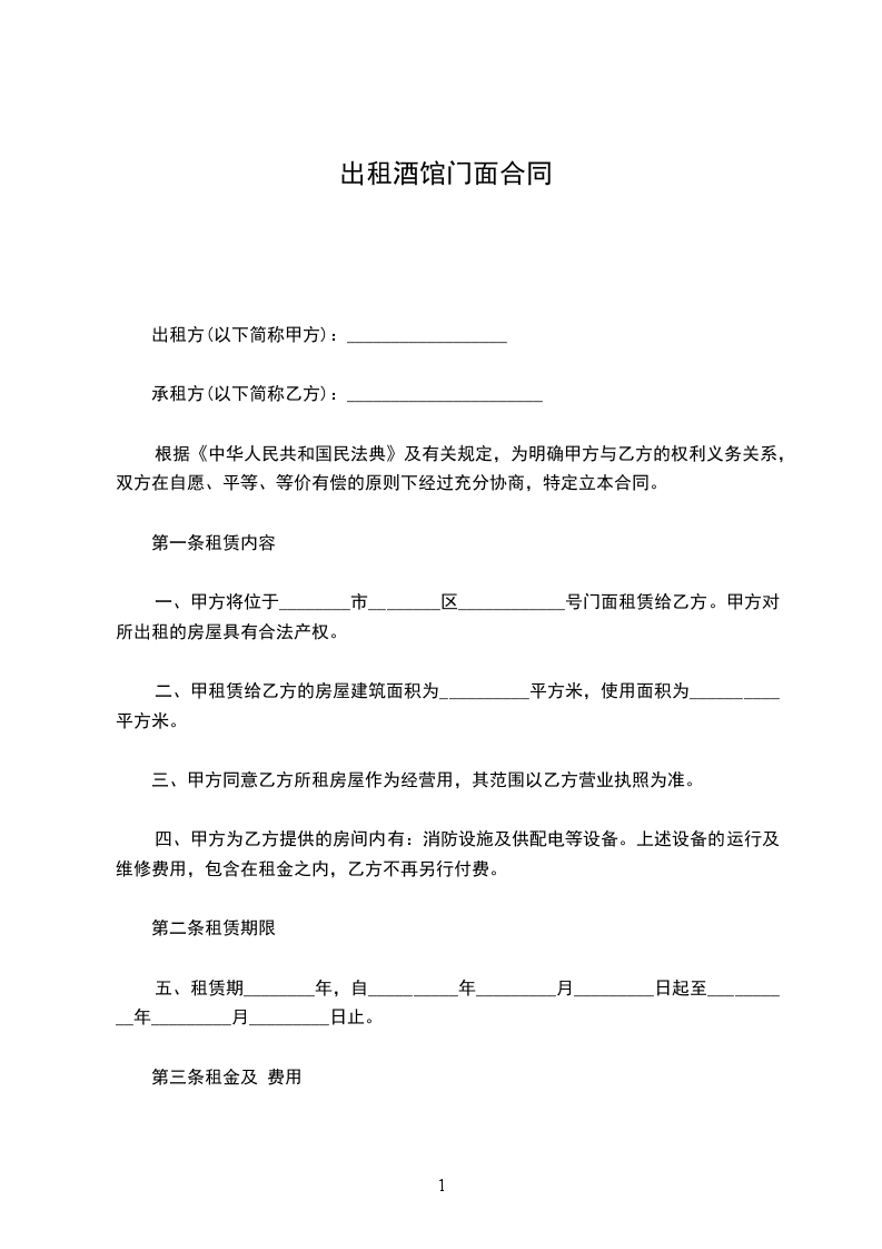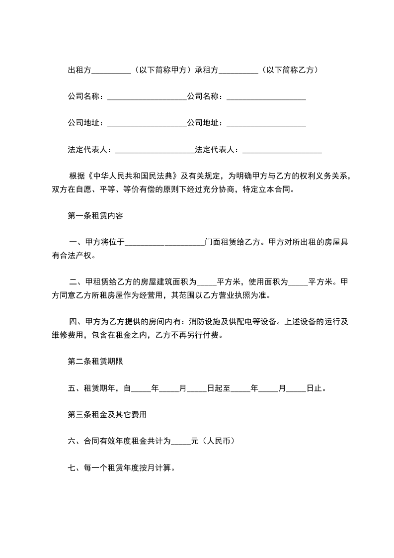 一、甲方将位于________市________区____________号门面租赁给乙方。甲方对所出租的房屋具有合法产权。