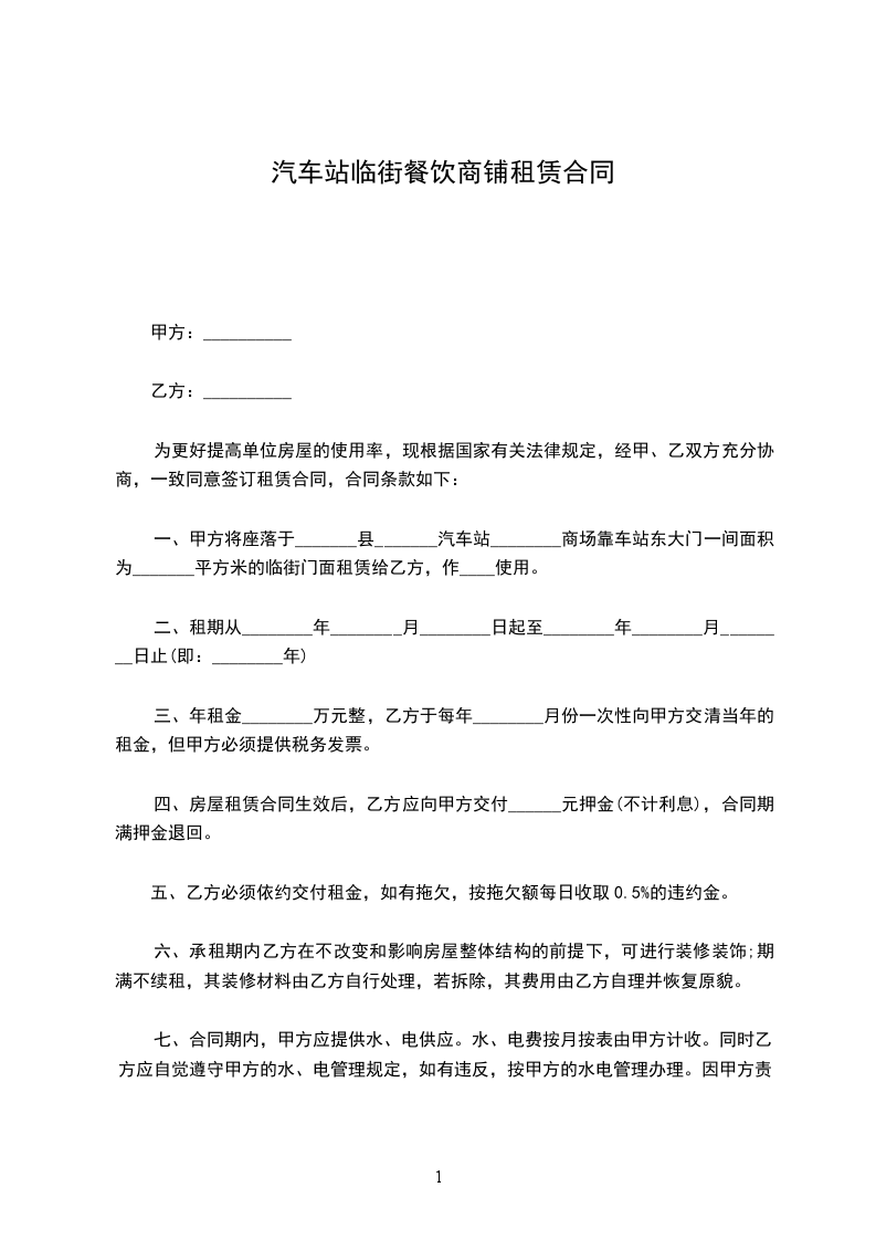 一、甲方将座落于_______县_______汽车站________商场靠车站东大门一间面积为_______平方米的临街门面租赁给乙方,作____使用。