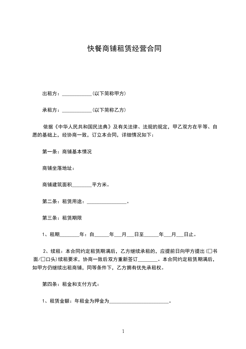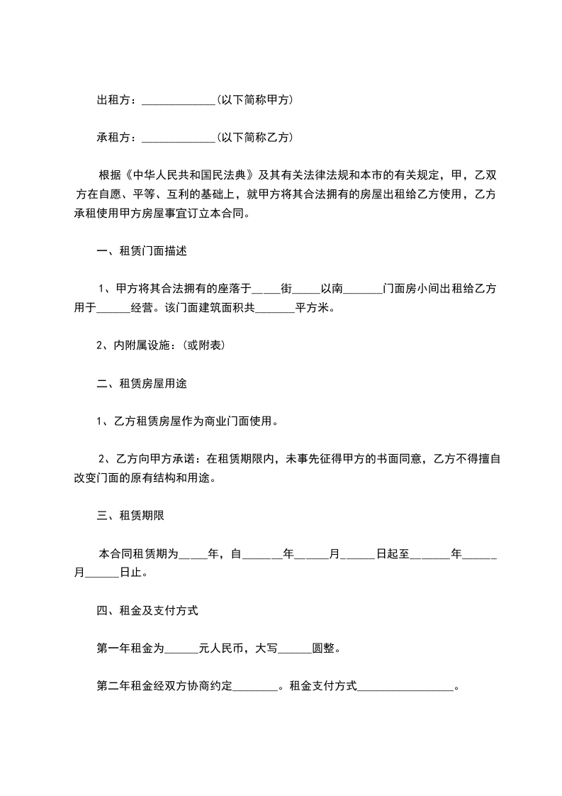 1、甲方将其合法拥有的座落于_____街_____以南_______门面房小间出租给乙方用于______经营。该门面建筑面积共_______平方米。
