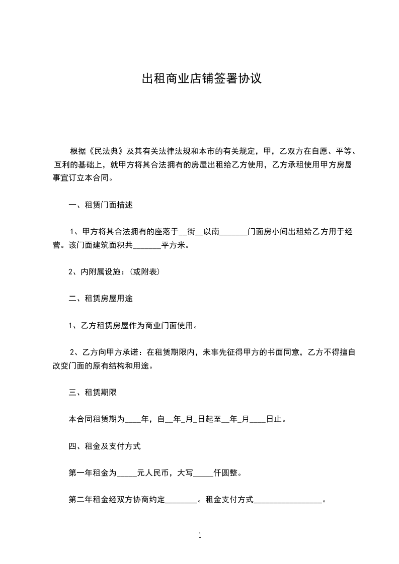 1、甲方将其合法拥有的座落于__街__以南_______门面房小间出租给乙方用于经营。该门面建筑面积共_______平方米。