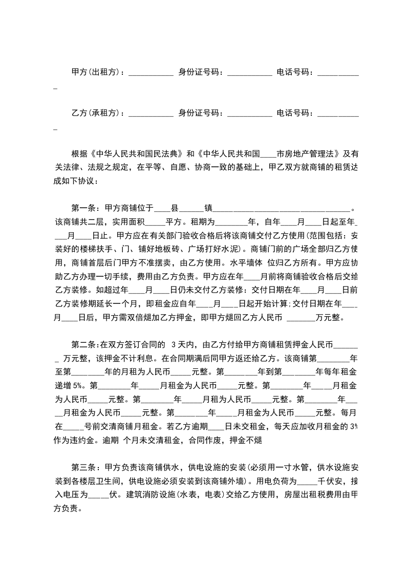 第一条:甲方商铺位于____县______镇_________________________________。该商铺共二层,实用面积_____平方。租期为________年,自年____月____日起至年____月____日止。甲方应在有关部门验收合格后将该商铺交付乙方使用(范围包括:安装好的楼梯扶手、门、铺好地板砖、广场打好水泥)。商铺门前的广场全部归乙方使用,商铺首层后门甲方不准摆卖,由乙方使用。水平墙体 位归乙方所有。甲方应协助乙方办理一切手续,费用由乙方负责。甲方应在年____月前将商铺验收合格后交给乙方装修。如超过年____月____日仍未交付乙方装修:交付日期在年____月____日前,乙方装修期延长一个月,即租金应自年____月____日起开始计算;交付日期在年____月____日后,甲方需双倍煺加乙方押金,即甲方煺回乙方人民币 _______万元整。