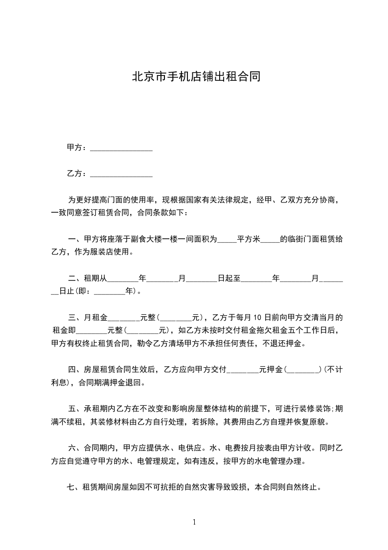 一、甲方将座落于副食大楼一楼一间面积为_____平方米_____的临街门面租赁给乙方,作为服装店使用。