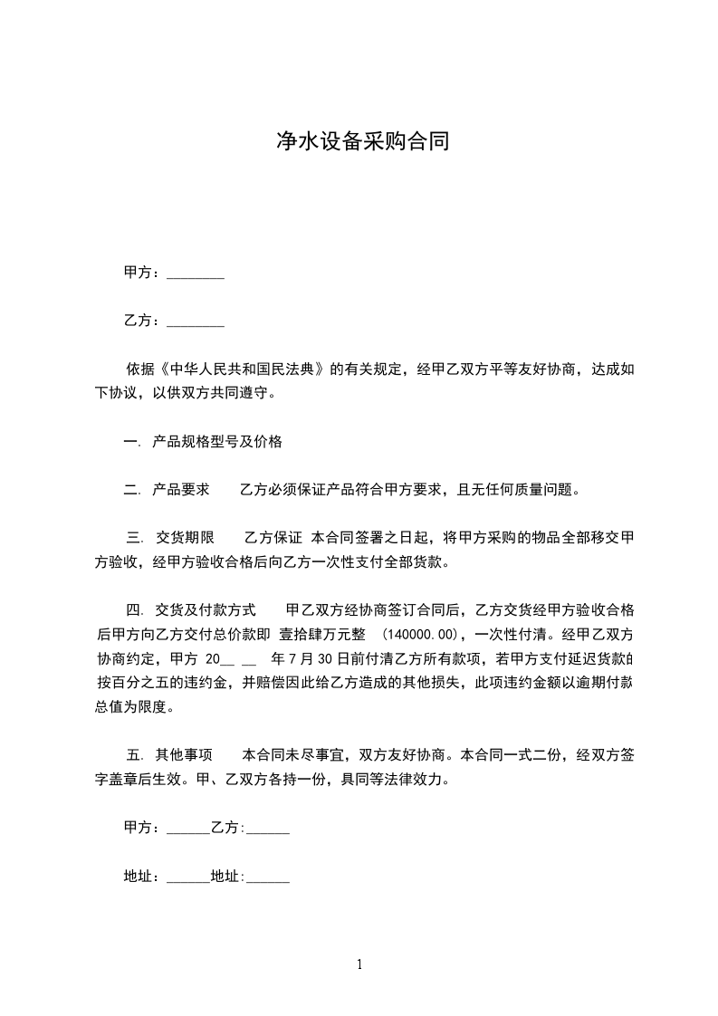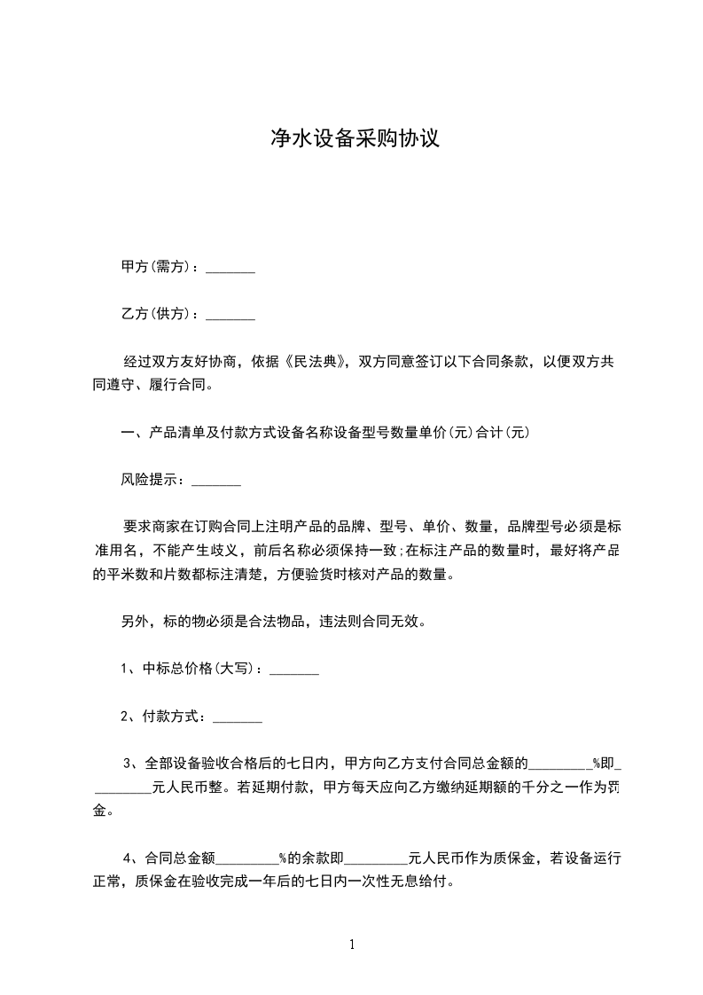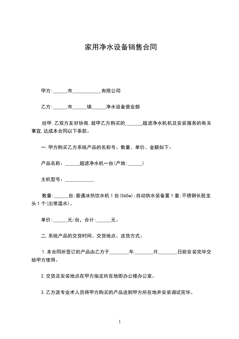经甲.乙双方友好协商,就甲乙方购买的_______超滤净水机机及安装服务的有关事宜,达成本合同以下条款。