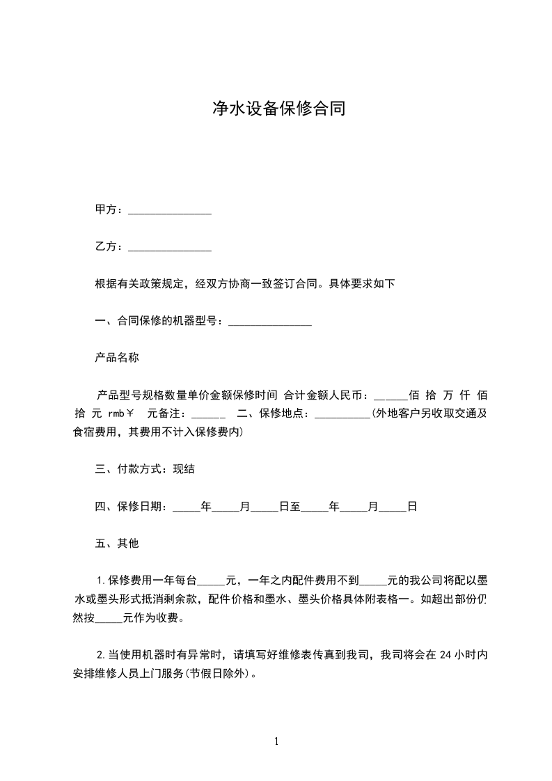 4.产品保修采用替换制,当设备发生故障,半日内不可以修好时,即以乙方技术人员带来的无故障的设进行替换,以保证甲方饮水系统正常运行,待有故障的设备修好后予以换回。