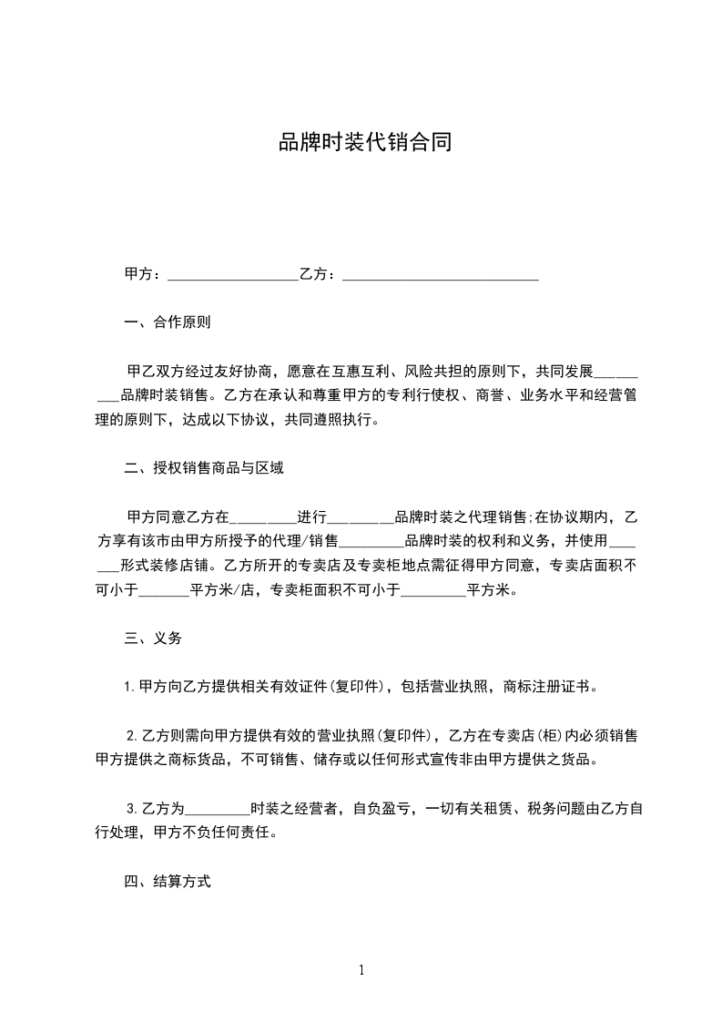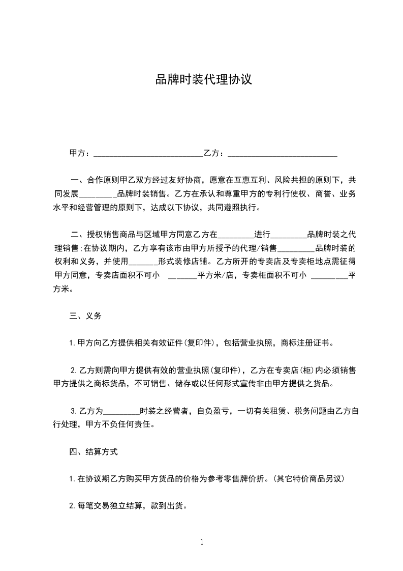 AB双方经过友好协商,愿意在互惠互利、风险共担的原则下,共同发展_________品牌时装销售。B方在承认和尊重A方的专利行使权、商誉、业务水平和经营管理的原则下,达成以下协议,共同遵照执行。