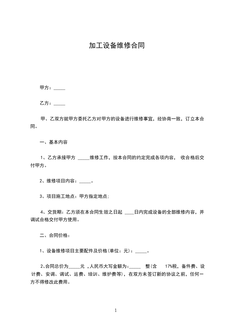 1、乙方承接甲方 _____维修工作,按本合同的约定完成各项内容, 收合格后交付甲方。