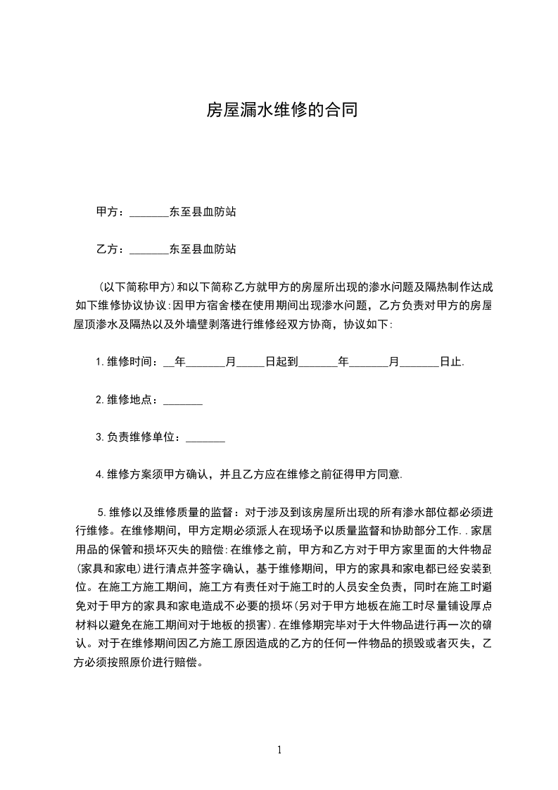 5.维修以及维修质量的监督:对于涉及到该房屋所出现的所有渗水部位都必须进行维修。在维修期间,甲方定期必须派人在现场予以质量监督和协助部分工作..家居用品的保管和损坏灭失的赔偿:在维修之前,甲方和乙方对于甲方家里面的大件物品(家具和家电)进行清点并签字确认,基于维修期间,甲方的家具和家电都已经安装到位。在施工方施工期间,施工方有责任对于施工时的人员安全负责,同时在施工时避免对于甲方的家具和家电造成不必要的损坏(另对于甲方地板在施工时尽量铺设厚点材料以避免在施工期间对于地板的损害).在维修期完毕对于大件物品进行再一次的确认。对于在维修期间因乙方施工原因造成的乙方的任何一件物品的损毁或者灭失,乙方必须按照原价进行赔偿。